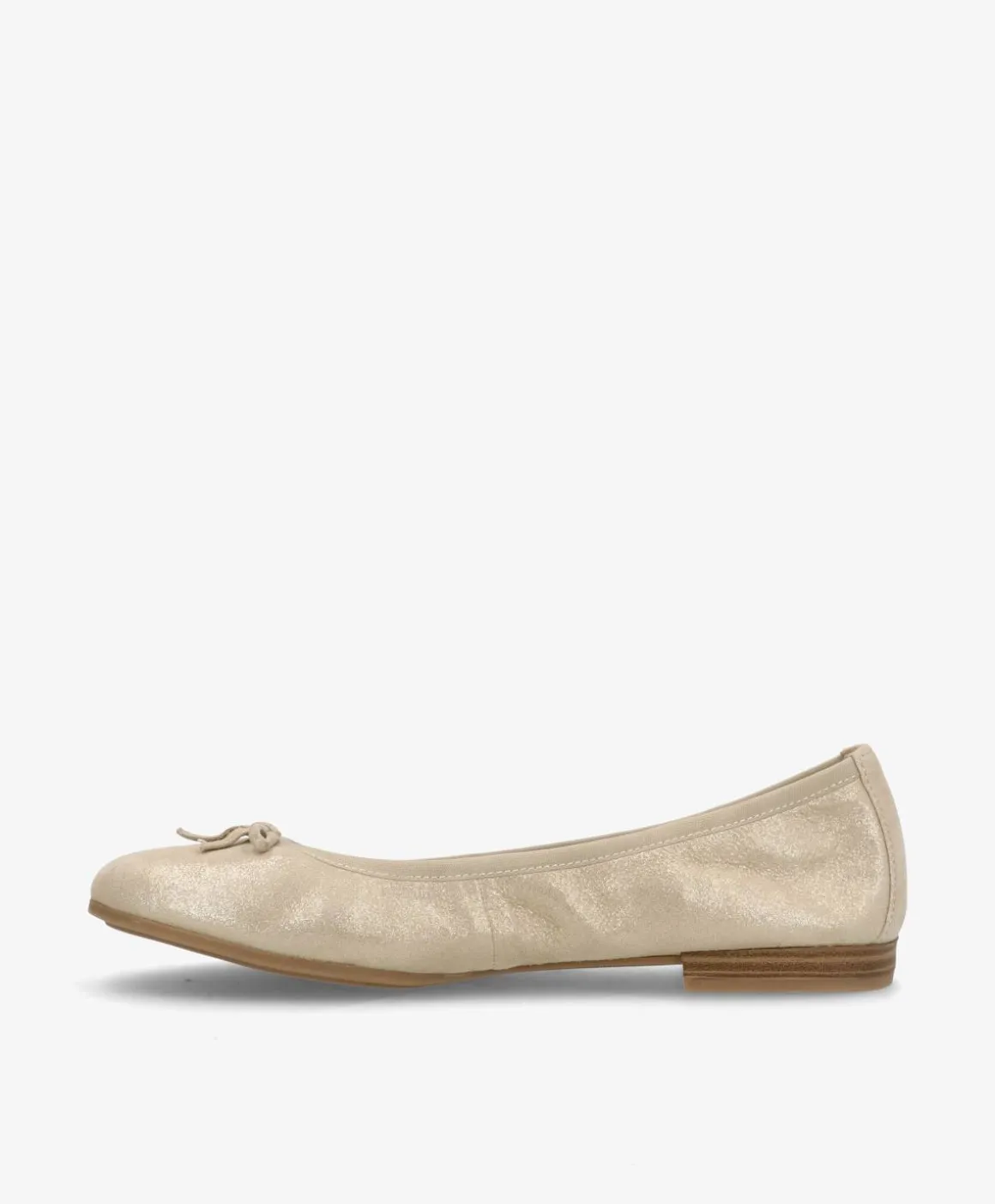 Feminine og elegante ballerinaer fra Tamaris i en smuk champagne farve. De smukke ballerinaer har en klassisk silhuet, der får et ekstra fint touch med den smalle sløje på fronten. Med den åbne pasform er de nemme at påføre og de sidder godt til med den lukkede snude. De har en flad, men blød bund og en helt kort hæl, der følger fodens naturlige svaj. De smukke ballerinaer er det perfekte match til hende, der har en elegant og feminin stil, og det stilrene design gør dem til en drøm at style.