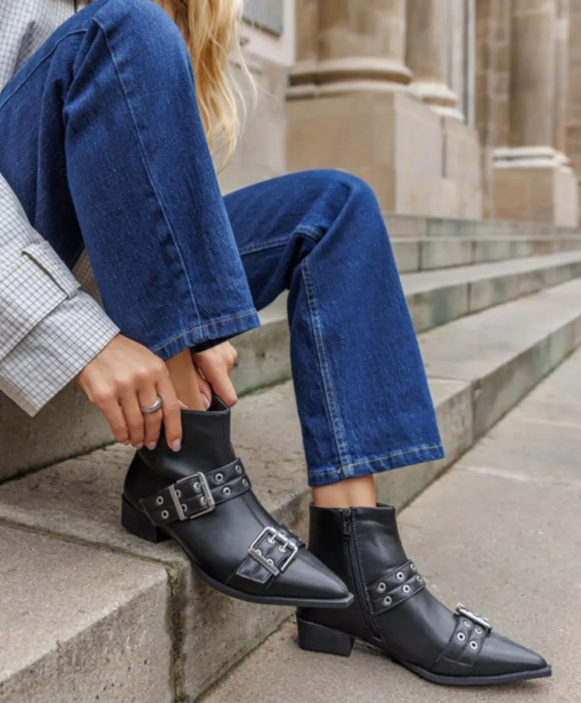 BELLE er en moderne ankelstøvle med et skarpt og stilrent udtryk. Den spidse snude og sølvfarvede spænder giver støvlen et feminint, men kantet look, der skiller sig ud i garderoben. Den bløde overflade i sort læderlook kombineret med praktisk lynlås i siden gør den både komfortabel og nem at tage på.