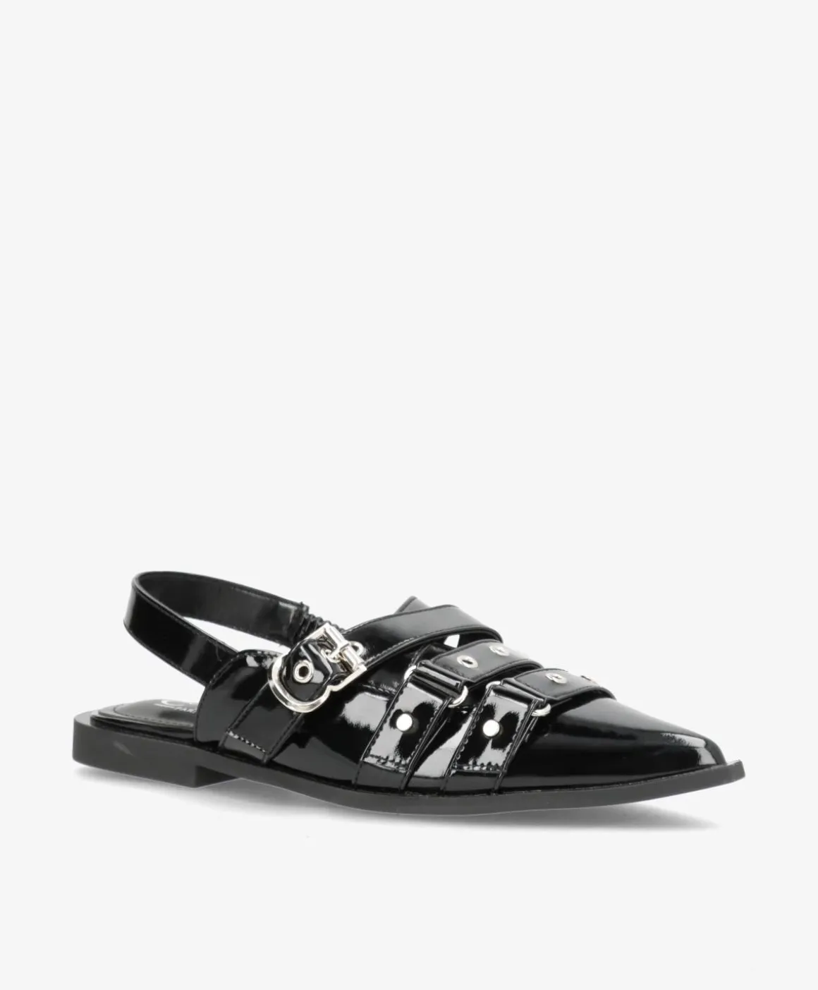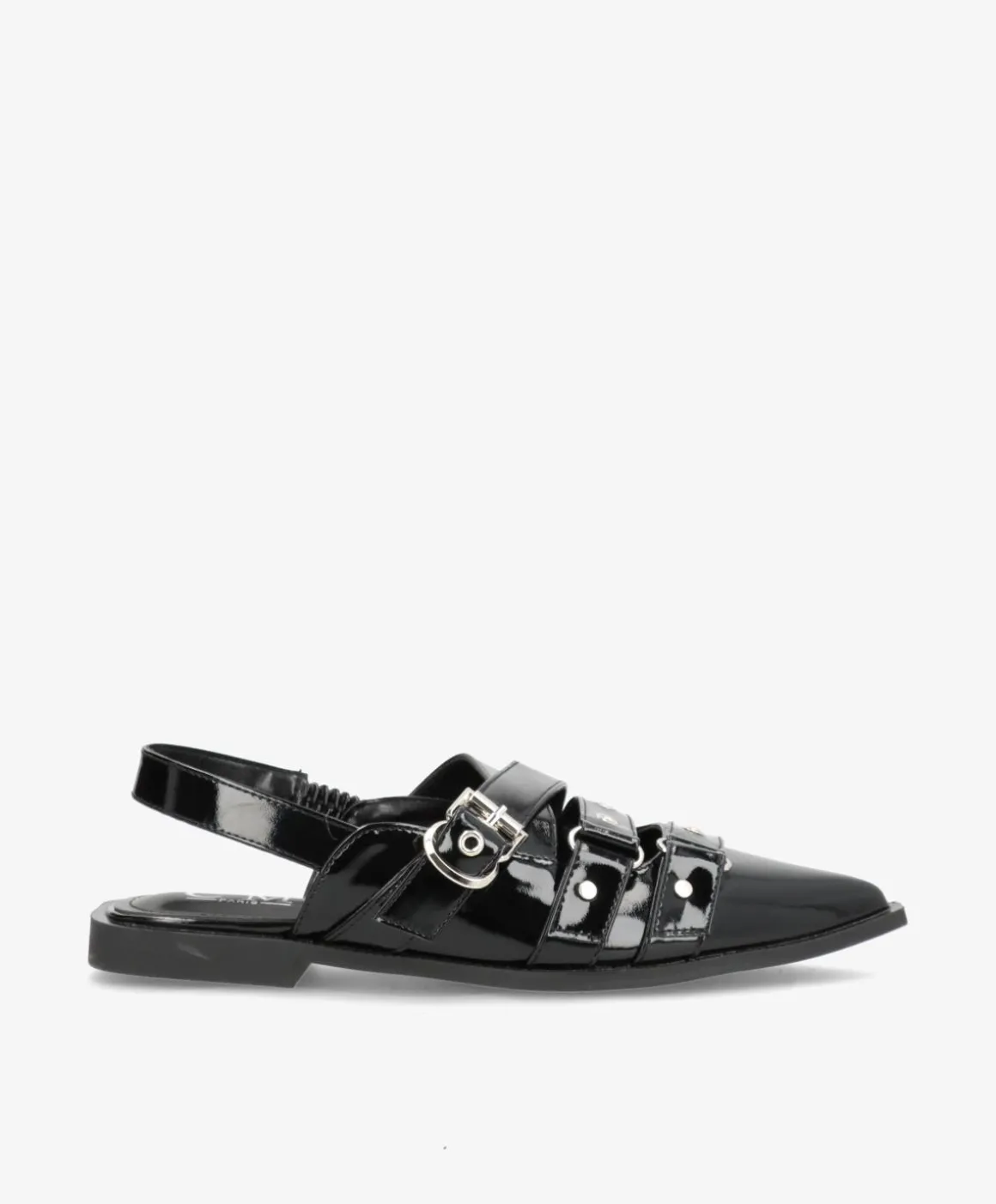 DIJON ballerinaen er en unik kombination af klassisk elegance og moderne detaljer. Den skinnende lak-finish tilføjer et eksklusivt touch, mens de justerbare remme med sølvspænder og nitter giver et edgy twist. Den spidse snude tilfører et sofistikeret look, som gør ballerinaen perfekt til både hverdag og fest.