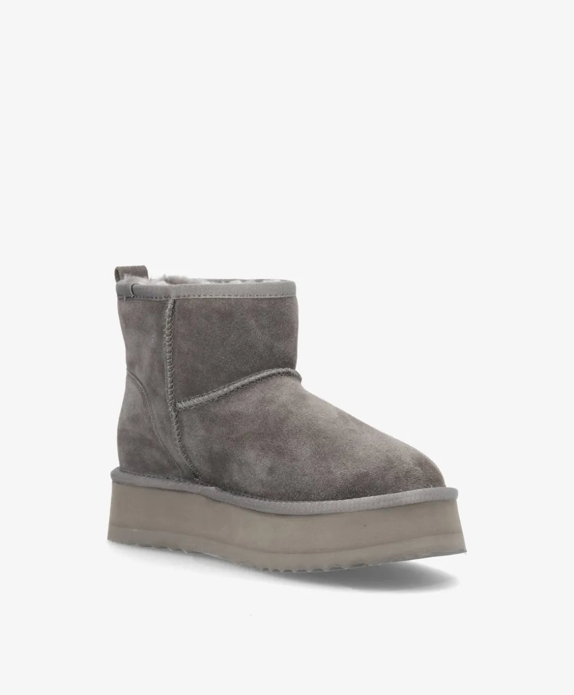 De lækreste bamsestøvler i en klassisk mørkegrå – perfekte til efterårsuniformen. De bløde støvler er lavet i et flot ruskind og har en høj sål, som giver et chunky look og løfter lidt. Støvlerne har ægte uld foring, som holder foden varm og giver ekstra komfort. De er nemme at påføre og er super komfortable, så de roligt kan bæres hele dagen. De fine bamsestøvler har desuden tydelige syninger, som bryder det rene design lidt.