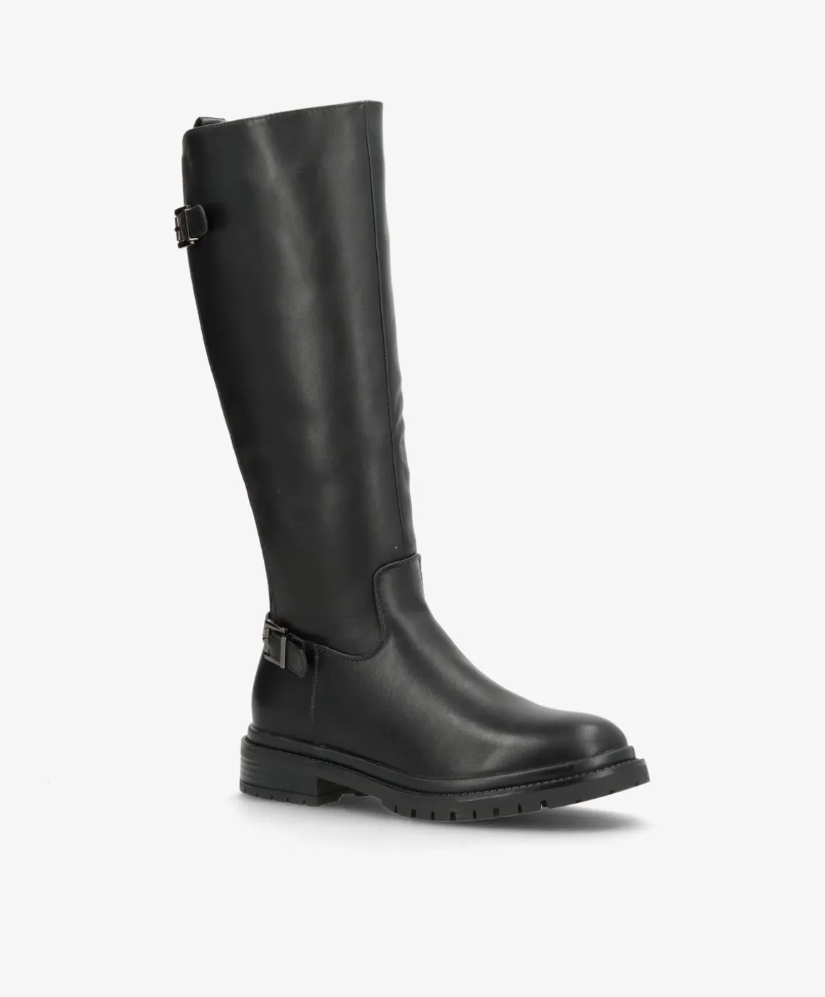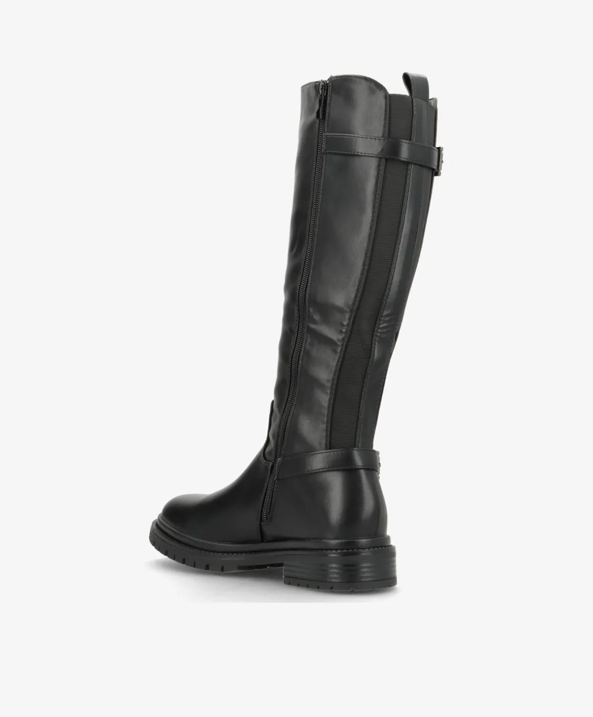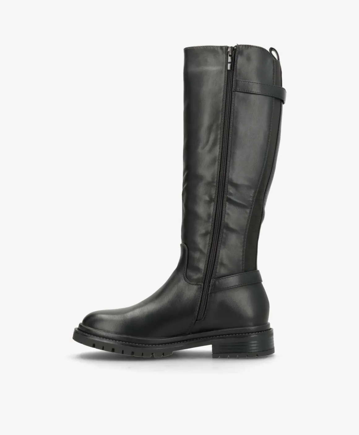 ENYA fra Havanna Shoes er en stilren knæhøj støvle med et moderne og funktionelt udtryk. Fremstillet i sort imiteret læder, kombinerer den en klassisk silhuet med praktiske detaljer som elastik i skaftet og spænder både foroven og ved anklen.