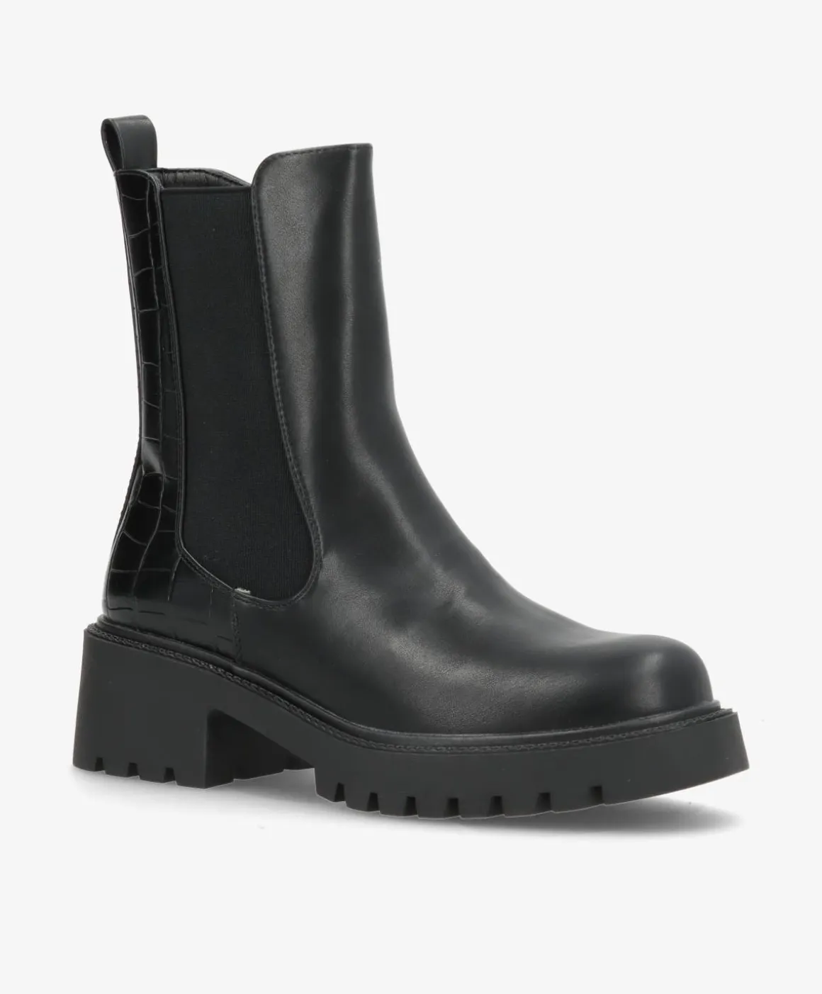 Smuk og stilren sort støvle i imiteret skind, der kombinerer enkelt design med trendy detaljer. Støvlen har en blød elastik i siden, der giver en fleksibel pasform, samt en solid gummisål, som sikrer komfort og stabilitet i hverdagen. Den blanke overflade i kombination med den let markerede struktur bagtil giver et elegant og moderne udtryk.
