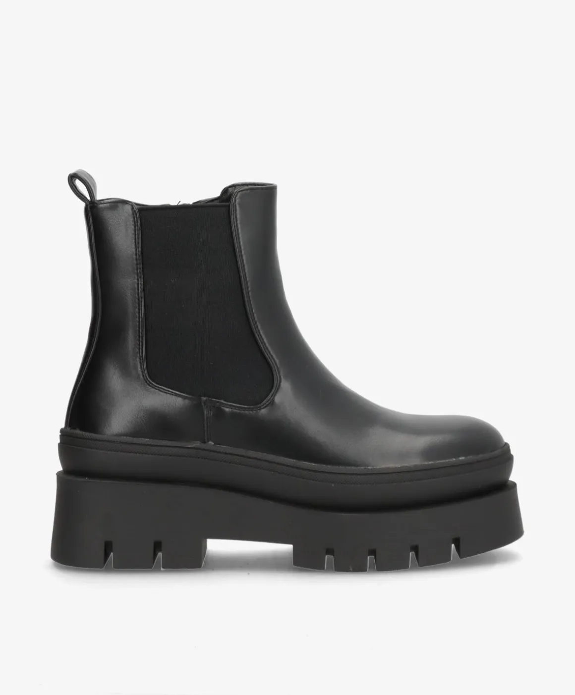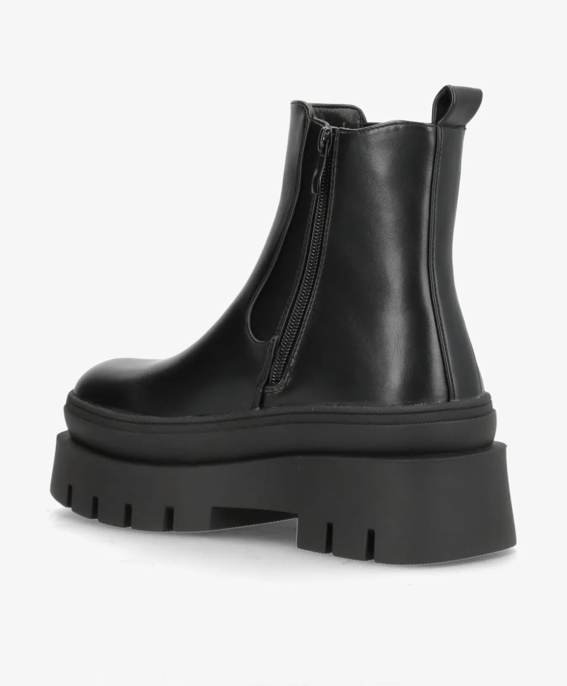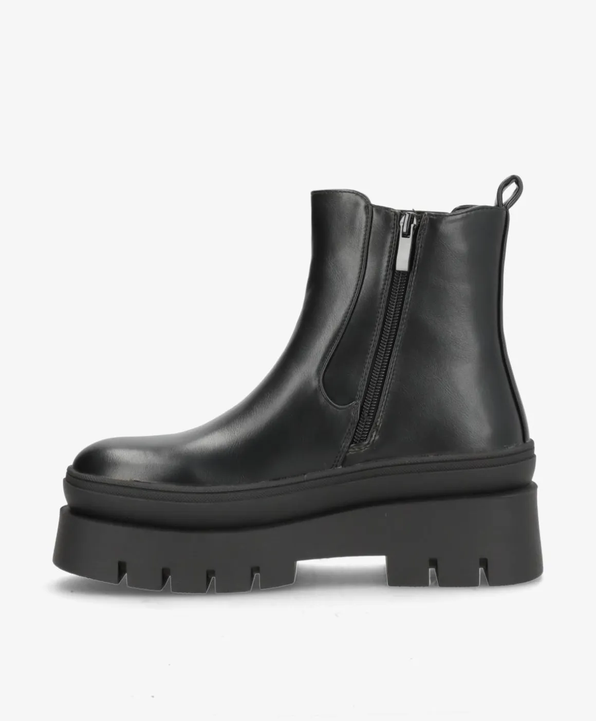 Elegant sort støvle i imiteret læder, designet med en kraftig platformsål, der giver både højde og komfort. Den klassiske chelsea-inspiration kombineres med en praktisk lynlås og fleksibel elastik, så støvlen er nem at tage af og på og sidder godt på foden hele dagen.