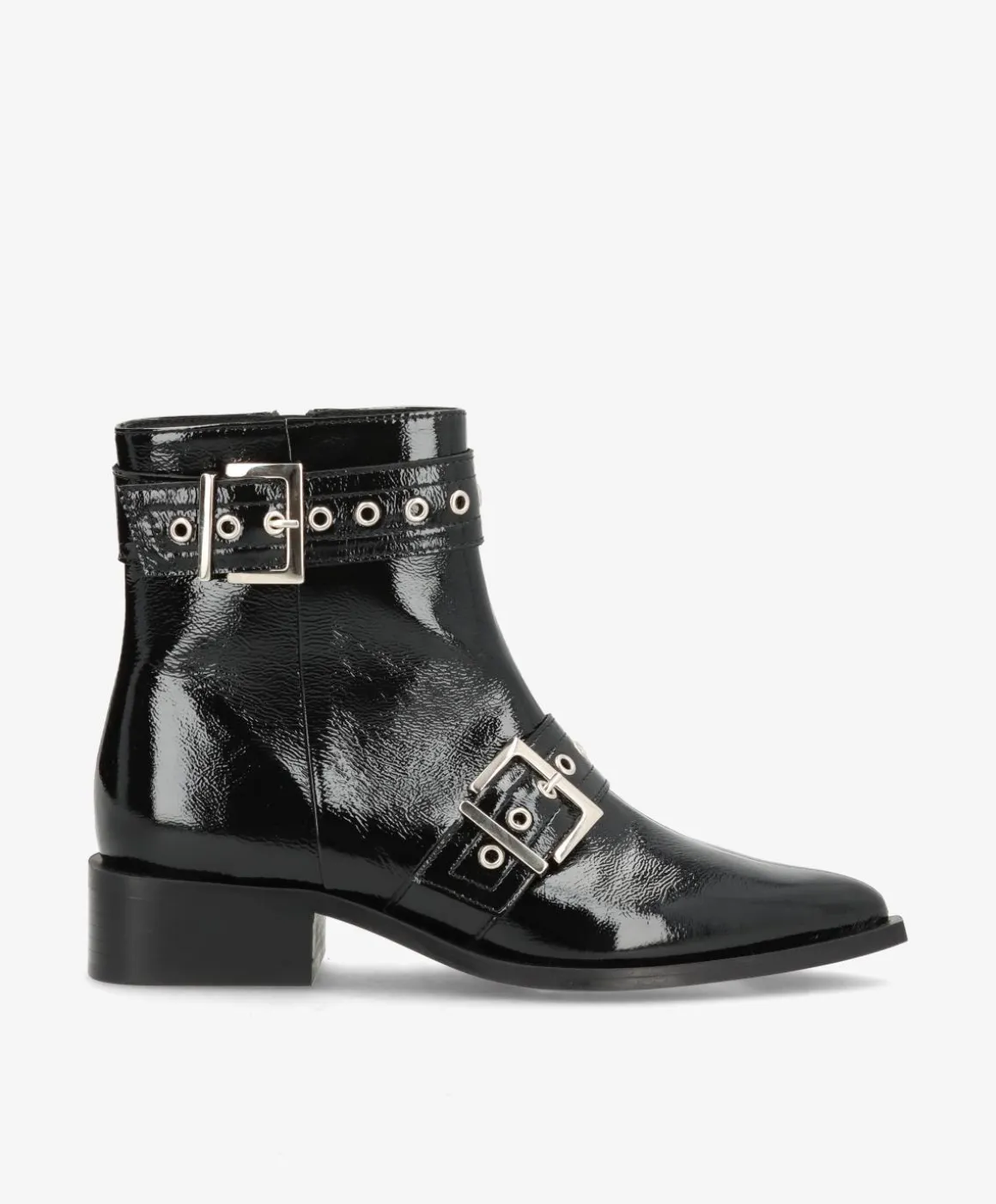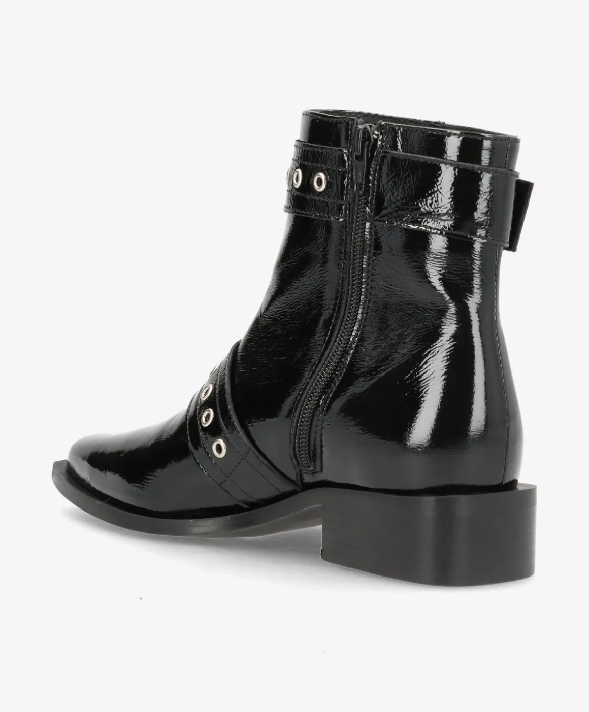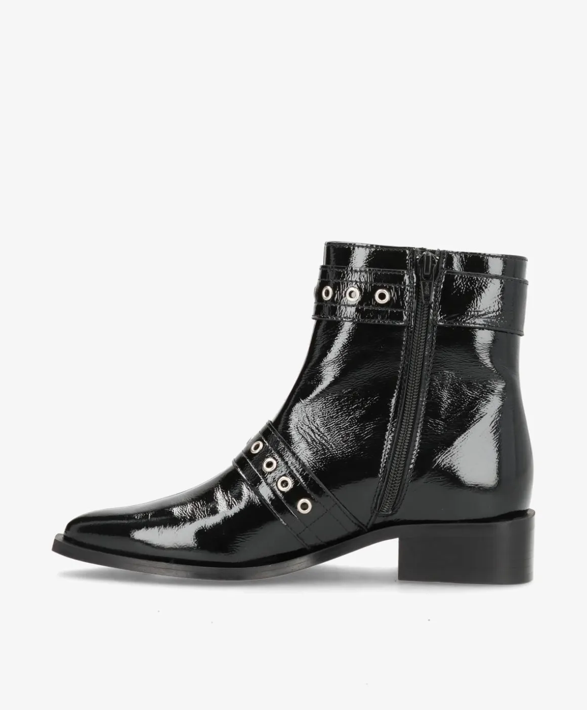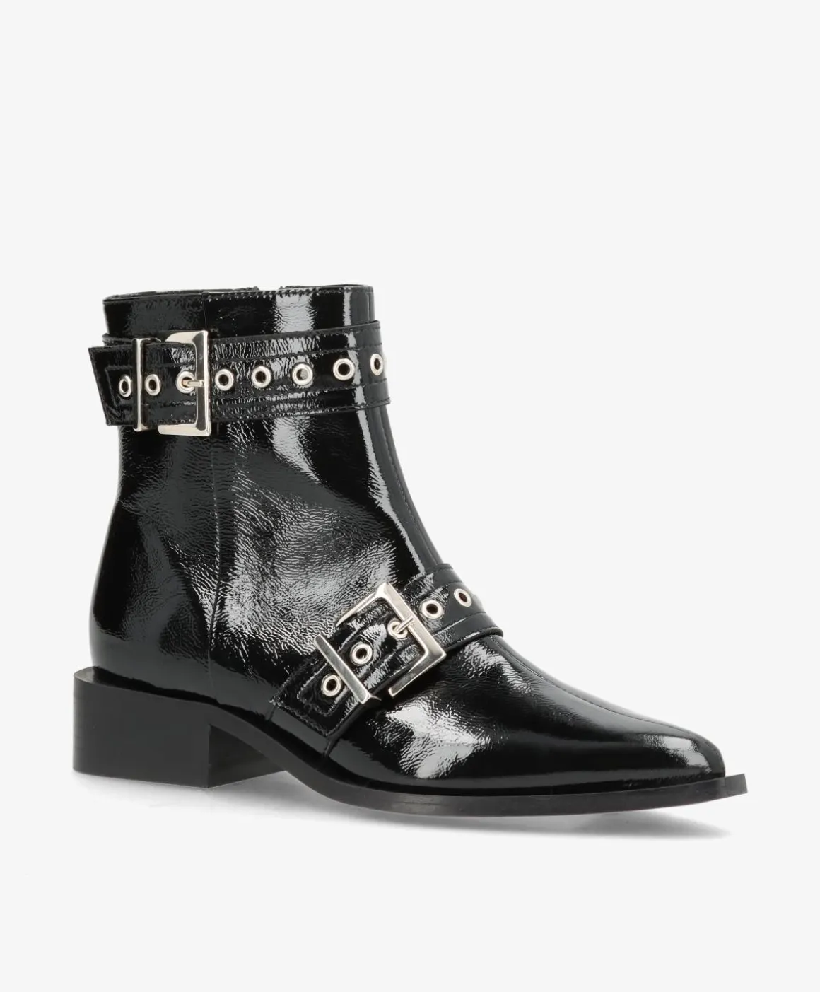 Bring attitude til dit look med de sorte JUSTIFIED lak støvler fra Phenumb Copenhagen. Disse støvler kombinerer den perfekte balance mellem kant og elegance. Lavet i en glansfuld sort lak, der straks fanger blikket, tilføjer de to dekorative spænder med sølvdetaljer et råt touch. De har en spids tå, der giver støvlerne et moderne udtryk, og den flade hæl gør dem behagelige nok til at have på hele dagen.