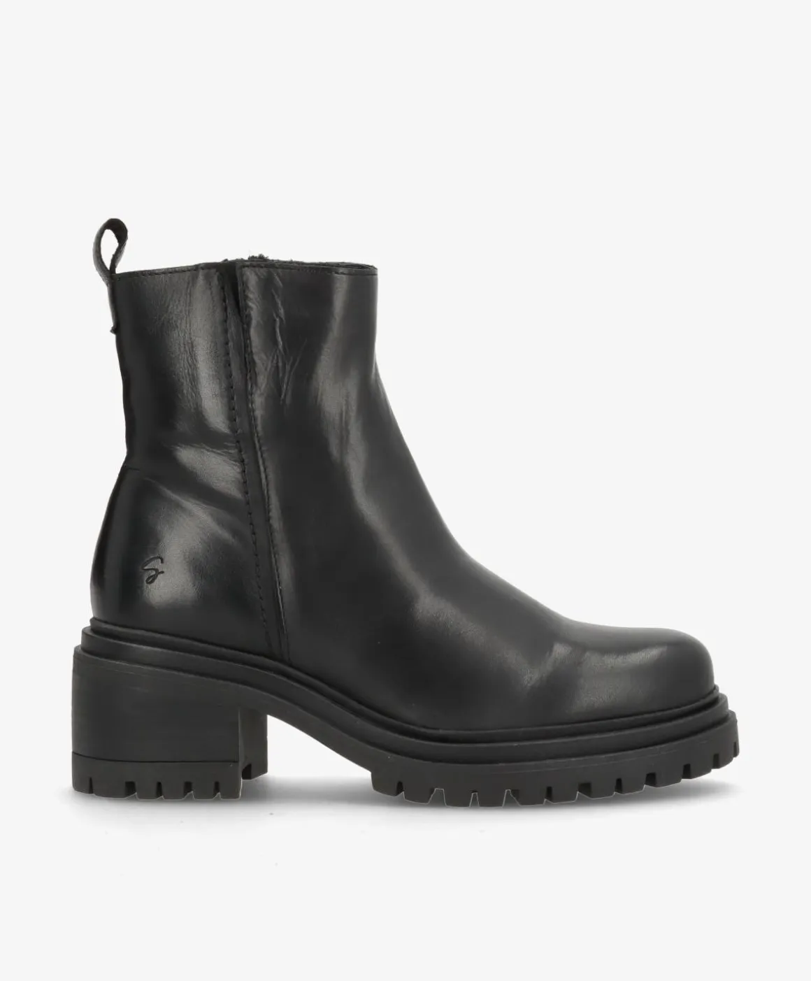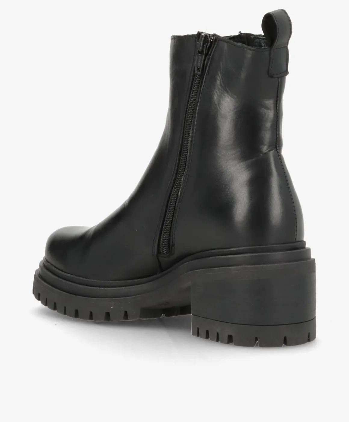 Denne sorte støvle er lavet i blødt, glansfuldt læder, som former sig flot om foden og giver et stilrent udtryk. Den mellem-høje skaft og den solide hæl giver god støtte, mens den grove sål sikrer stabilitet og greb – perfekt til efterår og vinter. Lynlåsen i siden gør støvlen nem at tage af og på.