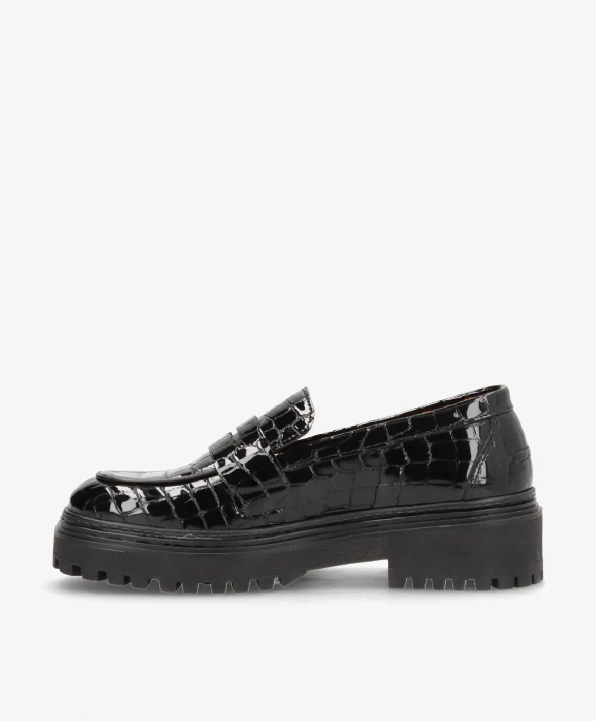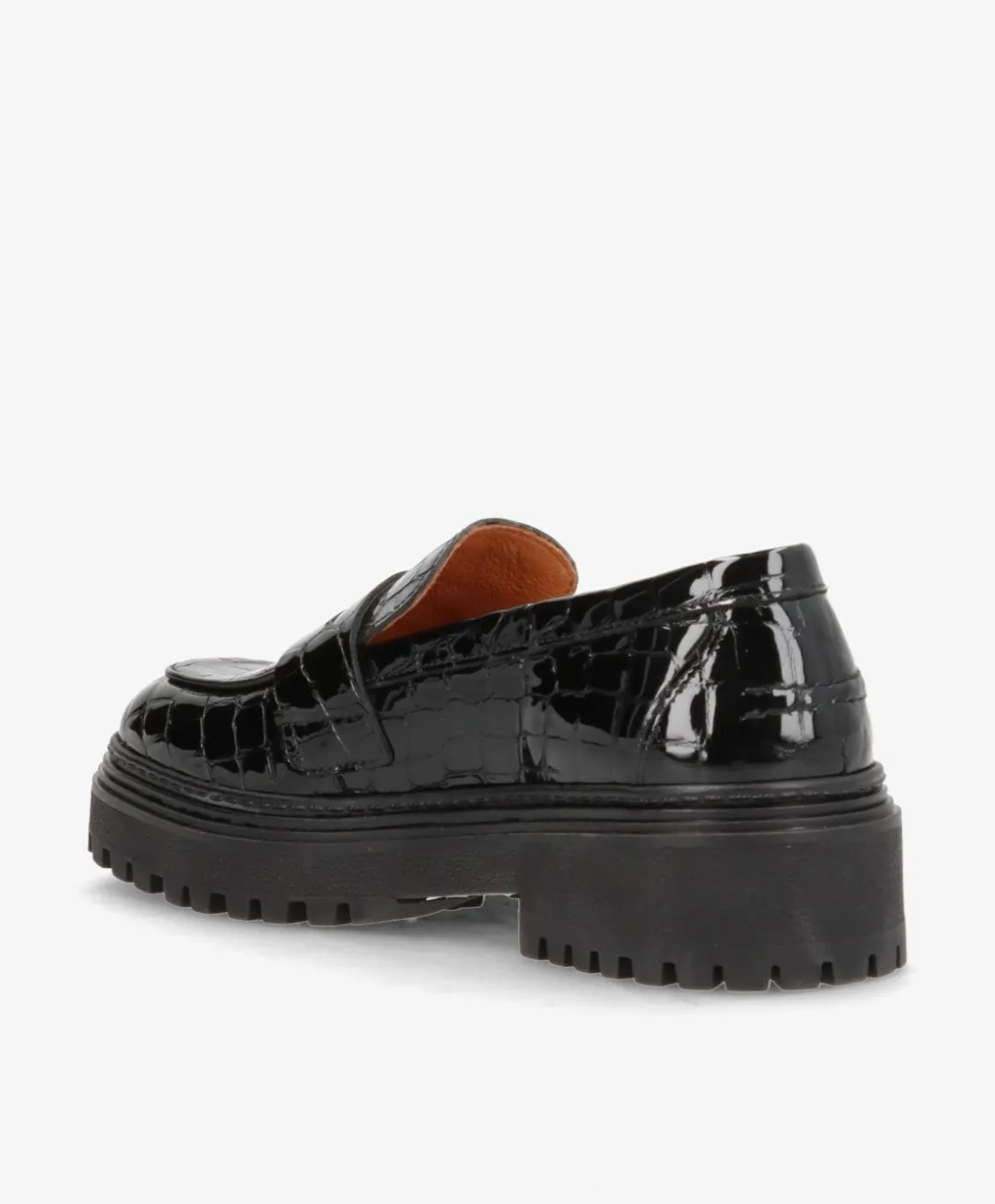 LEONNE loafer fra phenumb copenhagen er et moderne take på den klassiske loafer. Fremstillet i eksklusivt lak med krokodille præg, udstråler denne sko luksus og kvalitet. Den robuste, rillede sål sikrer et godt greb og tilføjer et råt touch til det ellers elegante design.