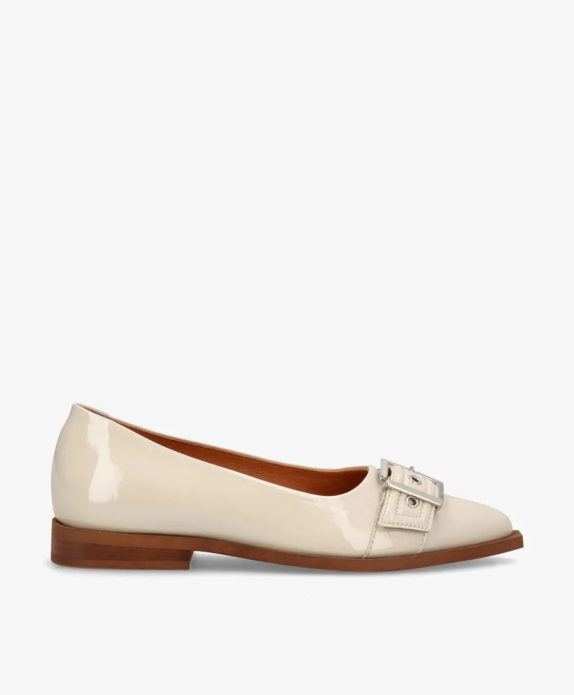 De smukkeste ballerinaer fra phenumb i en klassisk beige lak med lys bund. Ballerinaerne er det perfekte miks mellem det rå og feminine, og passer derfor perfekt ind i garderoben hos hende, der elsker at lege med stiludtrykket. Ballerinaerne har en spids snude, som giver et elegant look, og hælen er kantet, hvilket giver et moderne touch til designet. På fronten er de prydet med et groft spænde, der binder det hele sammen. De smukke ballerinaer kan bruges både til hverdag og fest, og kan styles på et væld af måder.