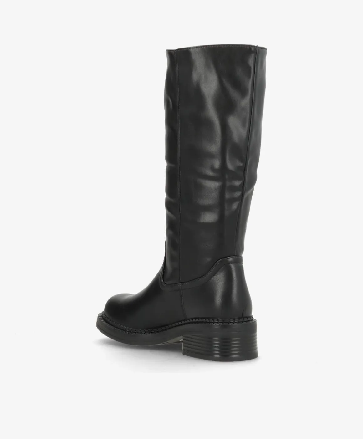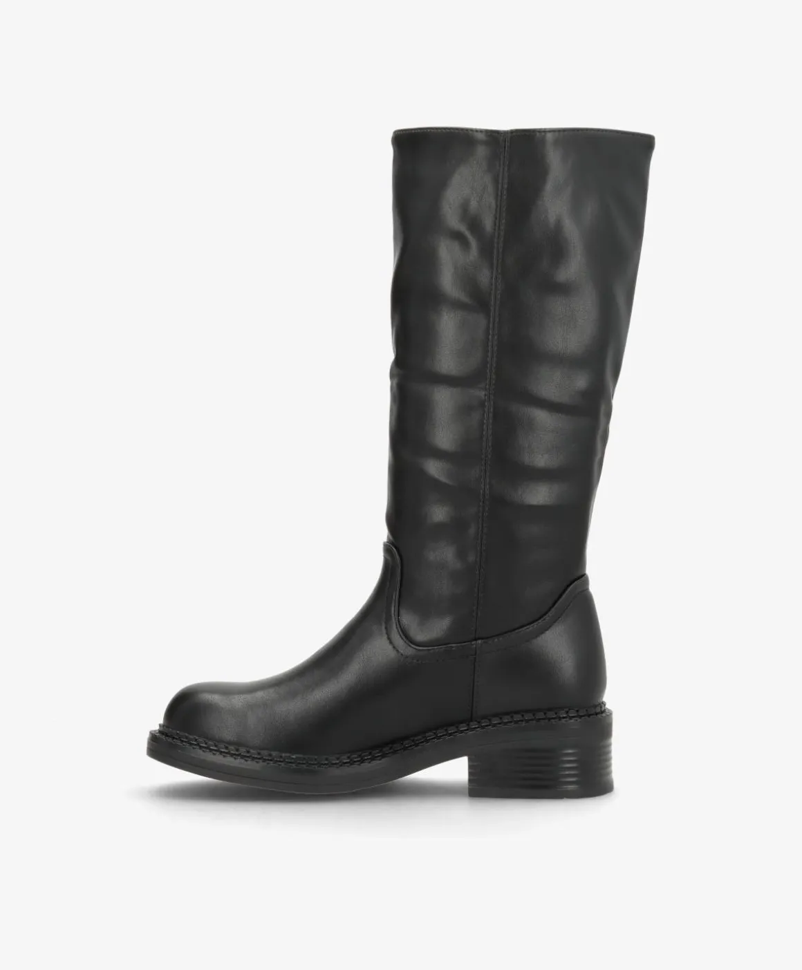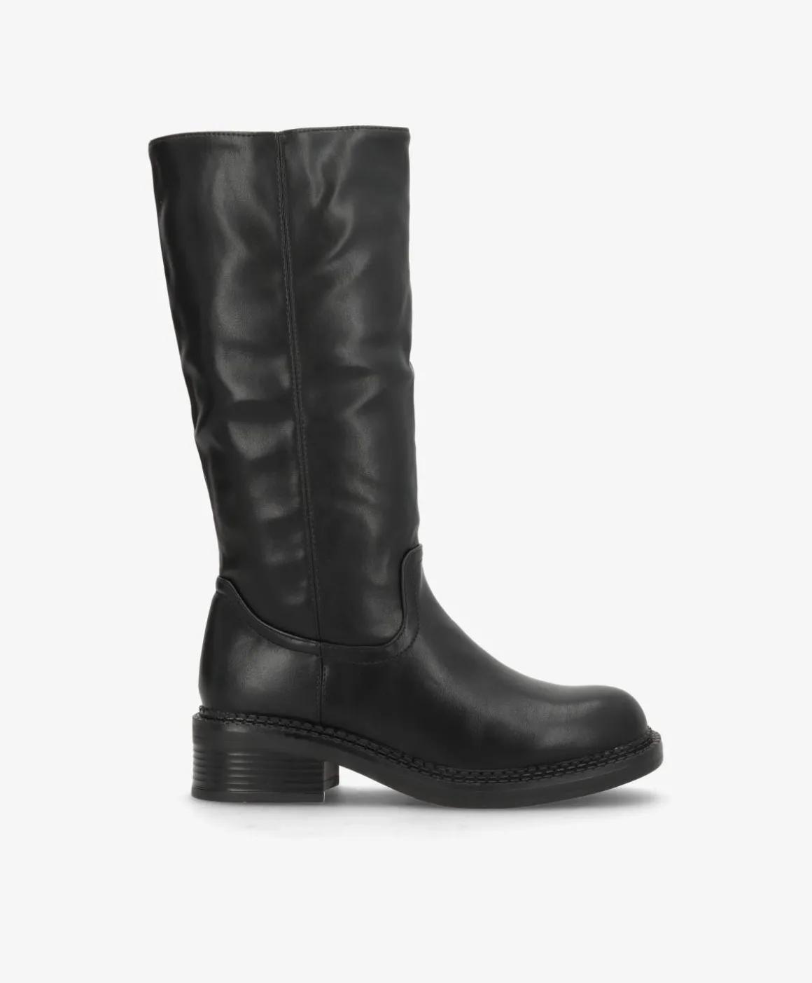 NAYA er en knæhøj støvle i flot, sort imiteret læder, der kombinerer enkelhed med karakter. Det rene design med rund snude og diskrete syninger gør den let at style med både strikkjoler, jeans og leggings. Den brede hæl og solide ydersål sikrer stabilitet og komfort til hverdagens mange skridt.