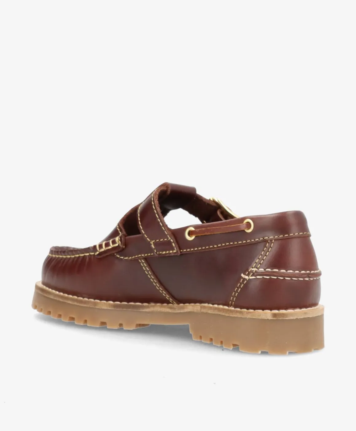 RUDDER T i brun læder fra phenumb copenhagen kombinerer klassisk sejlersko-look med et moderne twist. Den justerbare spænde giver både karakter og funktion, mens det bløde læder og de gyldne detaljer tilføjer en eksklusiv finish. Den solide gummisål med dybt mønster sikrer god komfort og greb, uanset hvor du går.