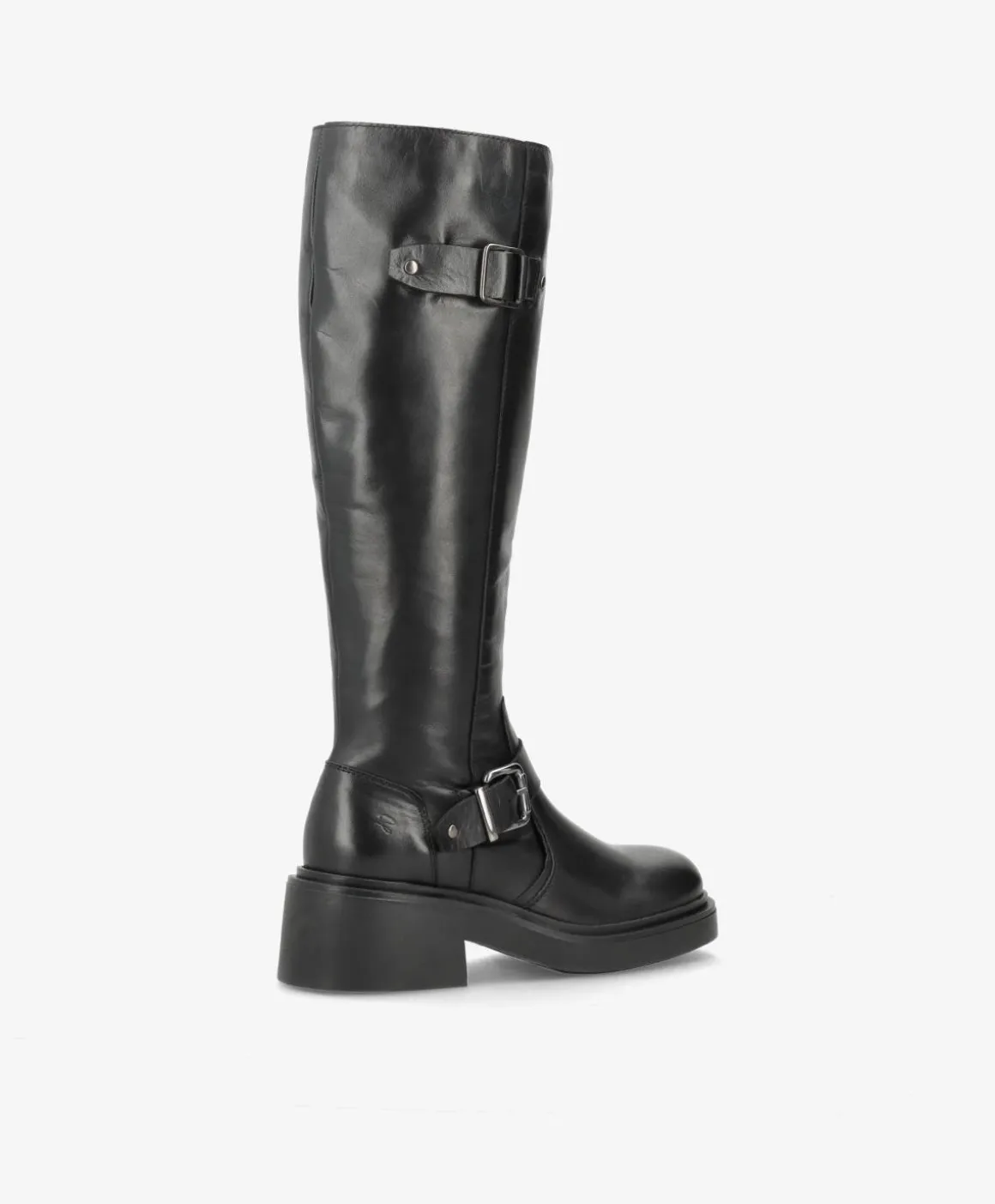 SADDLE LONG BUCKLE er en lang støvle i sort læder fra Shoedesign Copenhagen, designet til kvinder der ønsker et mere markant og moderne udtryk. De dekorative spænder med sølvdetaljer giver støvlen et eksklusivt biker-inspireret look, mens den solide blokhæl og gummisål sikrer både komfort og stabilitet.