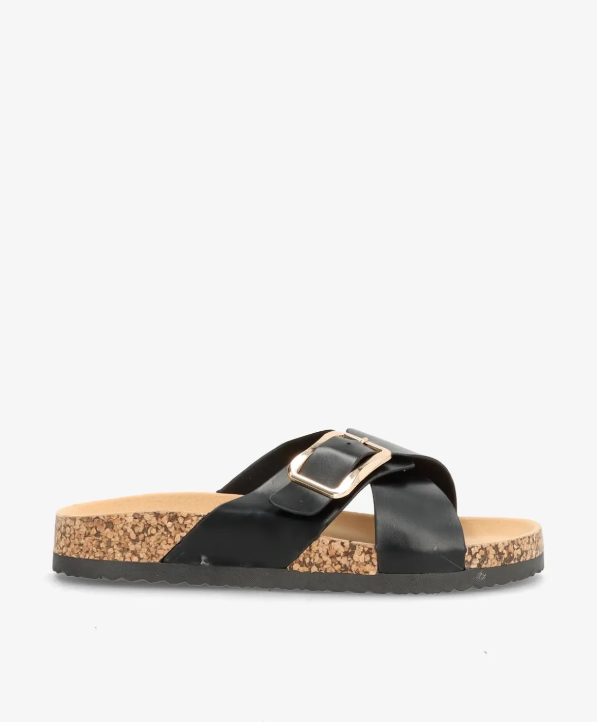 En klassisk sandal i sort med fine detaljer. Sandalerne har en biosål, som både giver et cool pift til designet og sørger for super god komfort. De er nemme at påføre med den åbne pasform, og de har krydsremme foran.