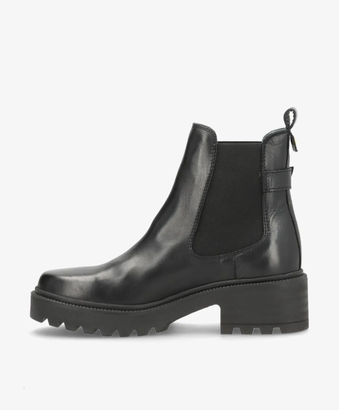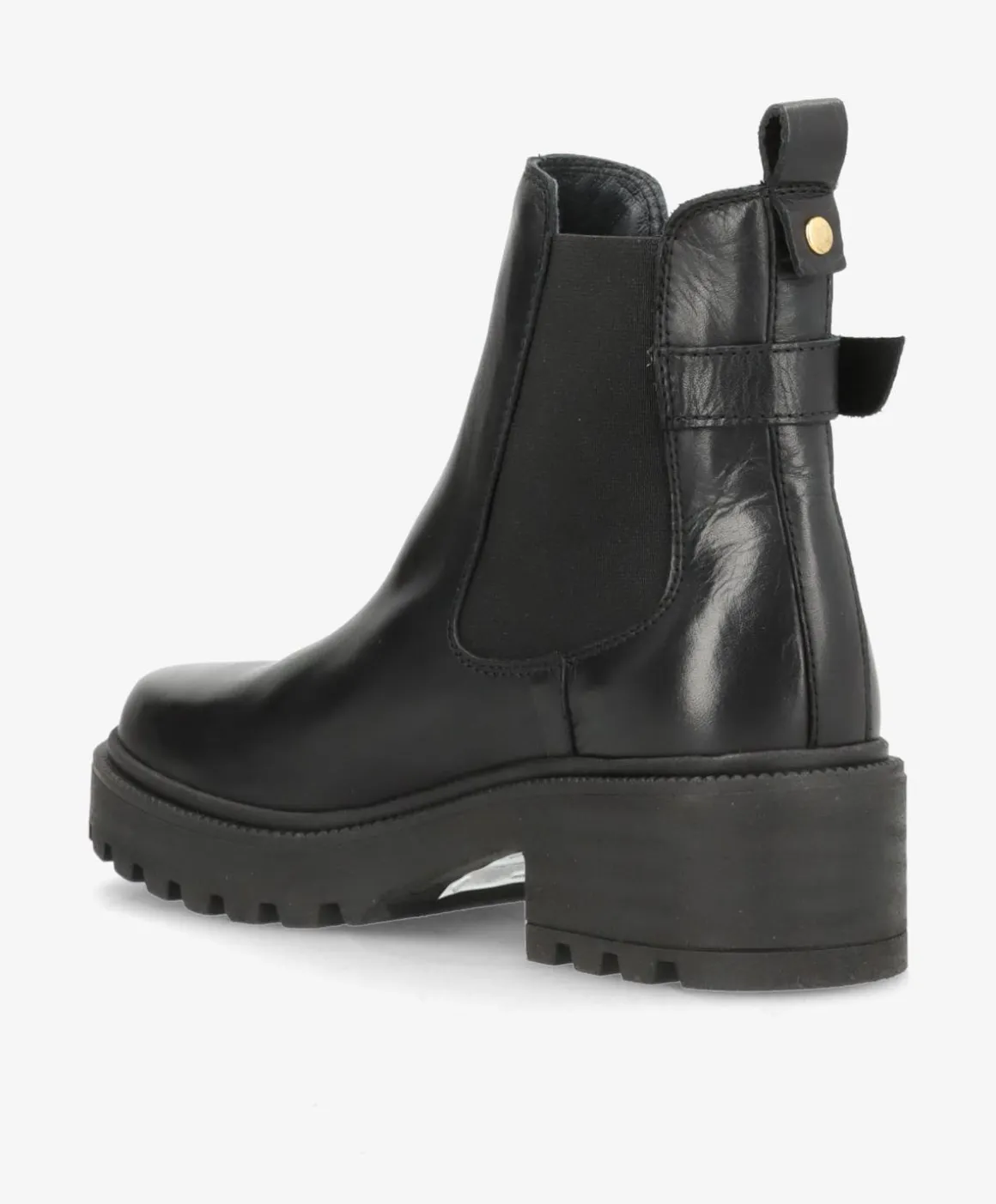 SARAH er en moderne fortolkning af den klassiske Chelsea støvle fra Shoedesign Copenhagen. Fremstillet i sort læder af høj kvalitet, kombinerer den et minimalistisk udtryk med eksklusive detaljer som den justerbare rem med guldfarvet spænde. Den elastiske sidepanel gør den nem at hoppe i, mens den robuste sål giver både stabilitet og komfort til hverdagsbrug.