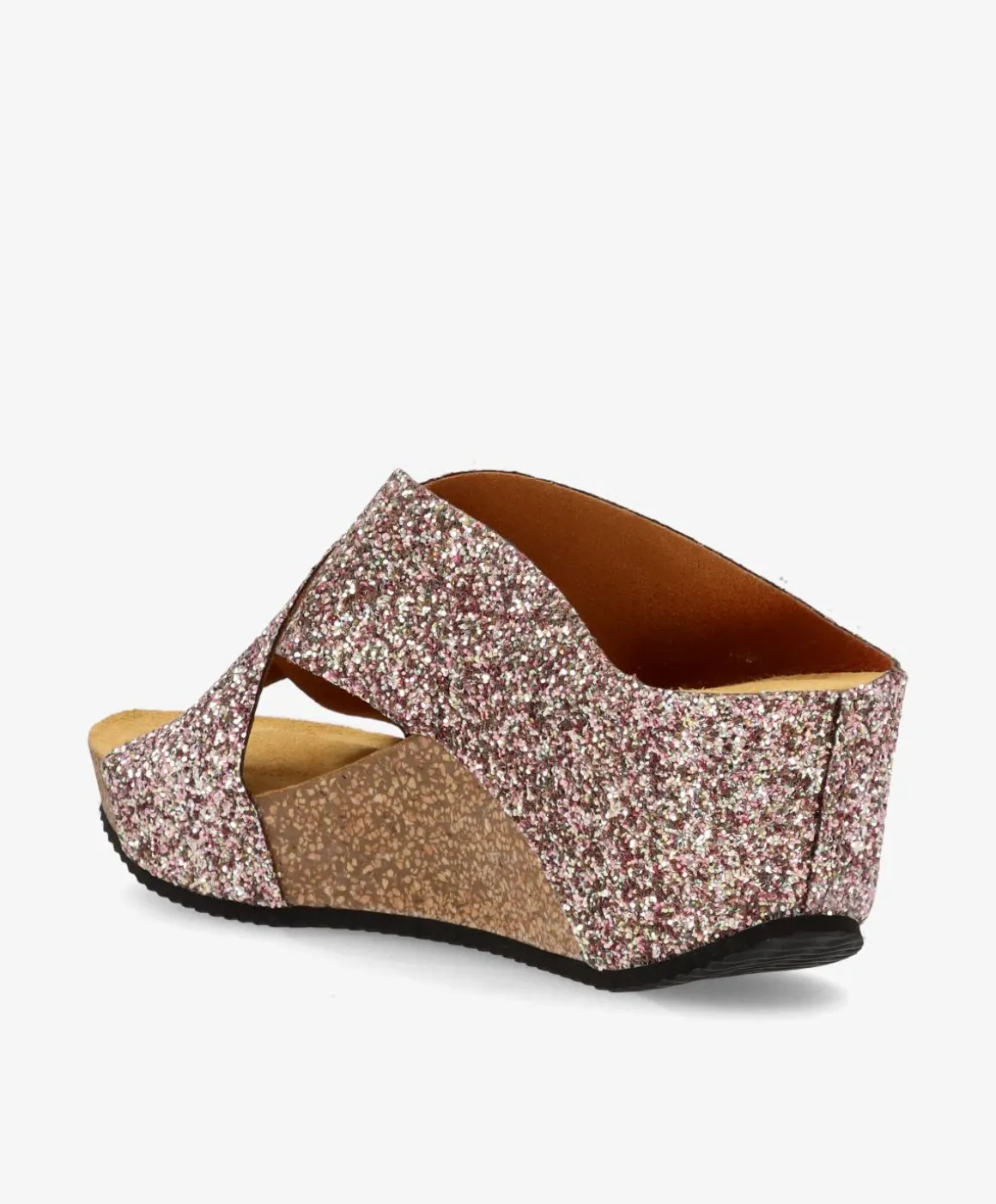 En smart sandal fra Shoedesign Copenhagen, der har flotte glimmer pailletter. Sandalen har kilehæl, som både giver komfort og lidt ekstra højde. Den har brede krydsremme over foden, så den sidder godt til og det giver et unikt touch til designet.