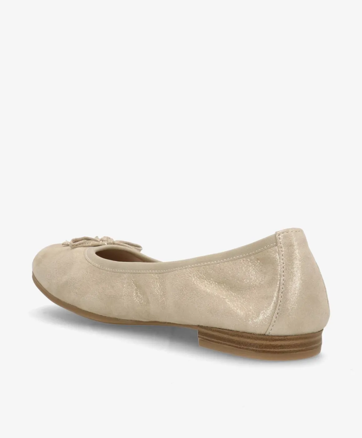 Feminine og elegante ballerinaer fra Tamaris i en smuk champagne farve. De smukke ballerinaer har en klassisk silhuet, der får et ekstra fint touch med den smalle sløje på fronten. Med den åbne pasform er de nemme at påføre og de sidder godt til med den lukkede snude. De har en flad, men blød bund og en helt kort hæl, der følger fodens naturlige svaj. De smukke ballerinaer er det perfekte match til hende, der har en elegant og feminin stil, og det stilrene design gør dem til en drøm at style.