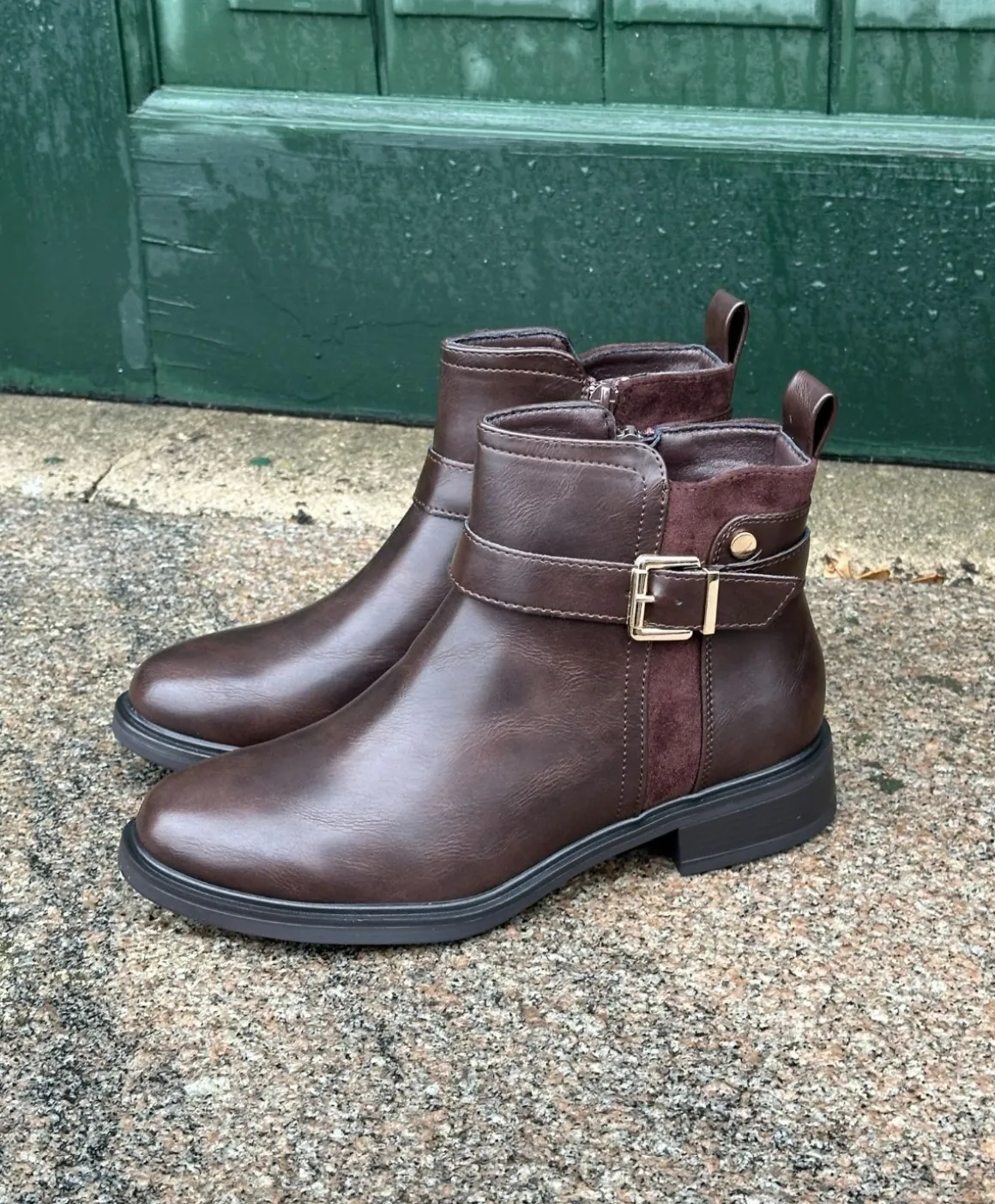 BEA er en klassisk og stilren ankelstøvle i mørkebrun imiteret skind, perfekt til dig der ønsker et tidløst look med et feminint touch. Den gyldne spænde og kontrast i ruskindslook på skaftet tilføjer eksklusive detaljer, som løfter designet.