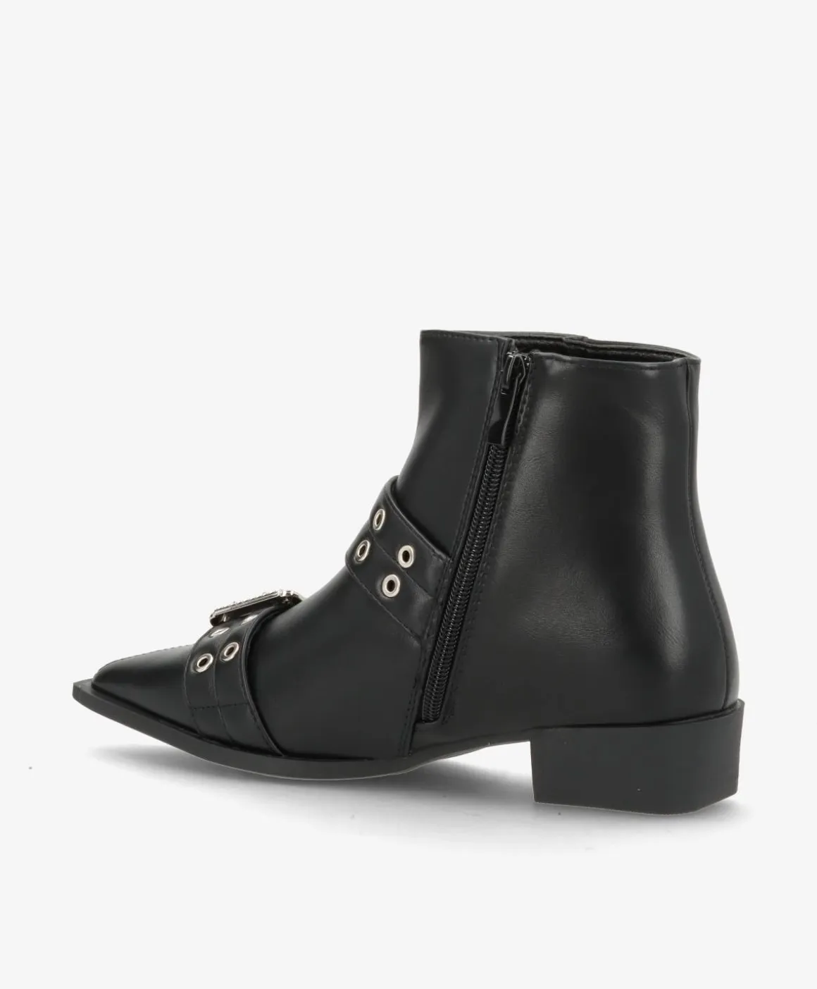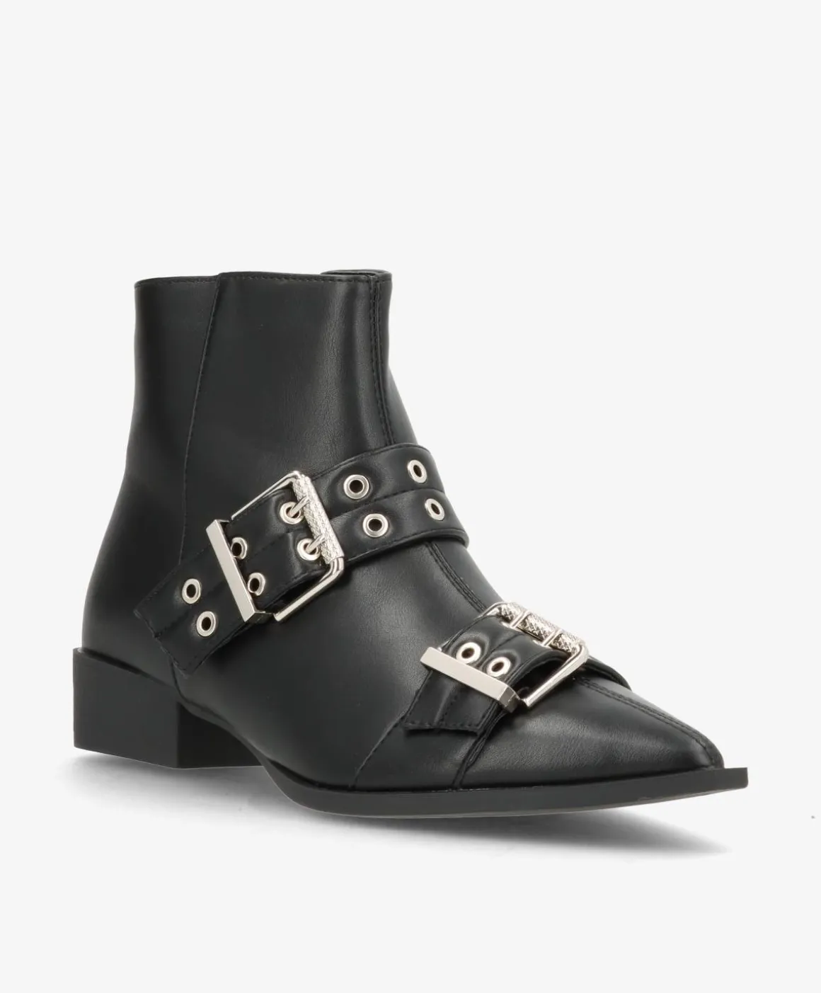 BELLE er en moderne ankelstøvle med et skarpt og stilrent udtryk. Den spidse snude og sølvfarvede spænder giver støvlen et feminint, men kantet look, der skiller sig ud i garderoben. Den bløde overflade i sort læderlook kombineret med praktisk lynlås i siden gør den både komfortabel og nem at tage på.