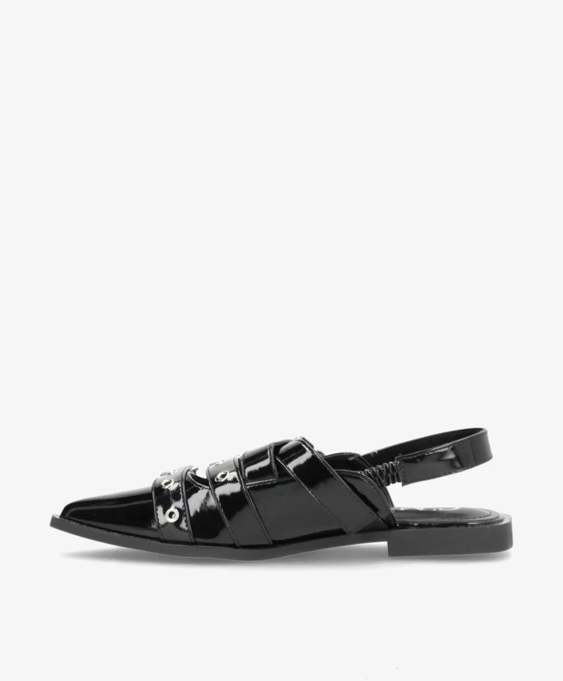 DIJON ballerinaen er en unik kombination af klassisk elegance og moderne detaljer. Den skinnende lak-finish tilføjer et eksklusivt touch, mens de justerbare remme med sølvspænder og nitter giver et edgy twist. Den spidse snude tilfører et sofistikeret look, som gør ballerinaen perfekt til både hverdag og fest.
