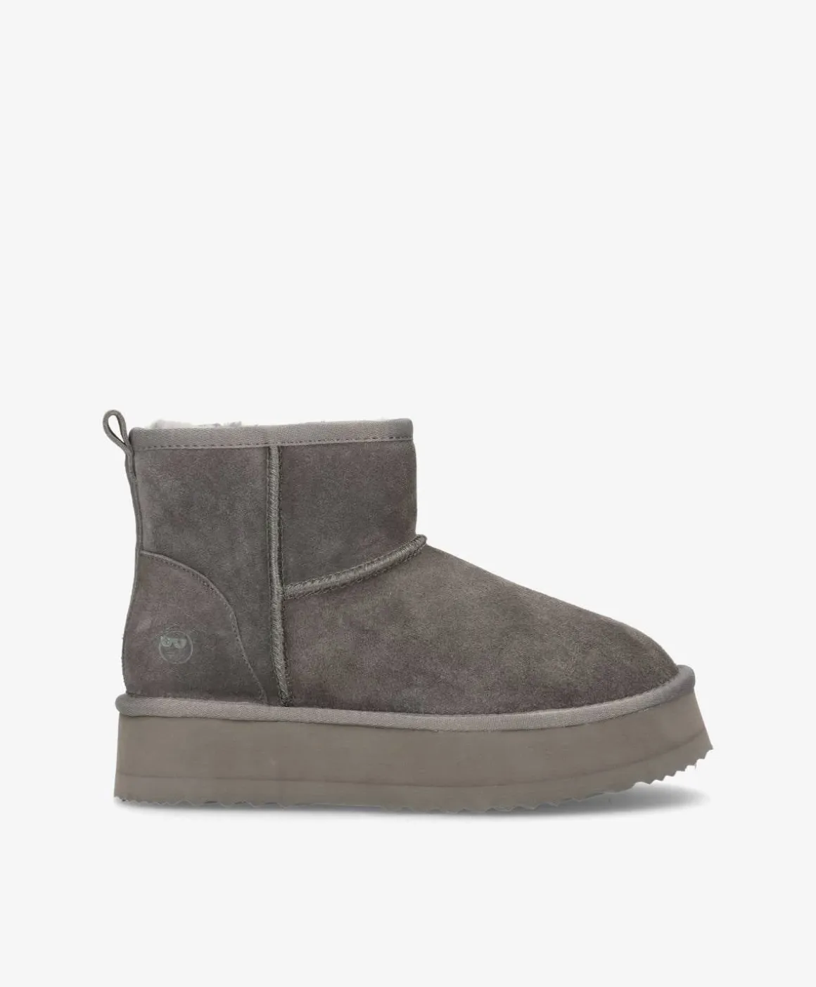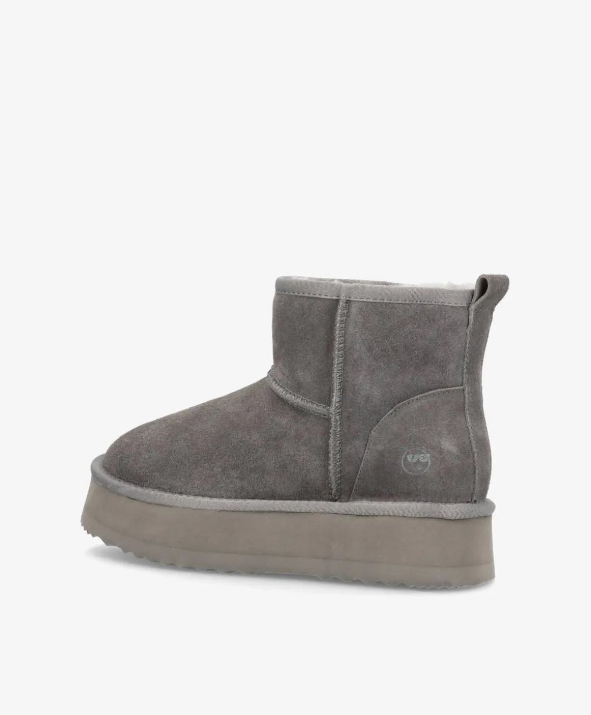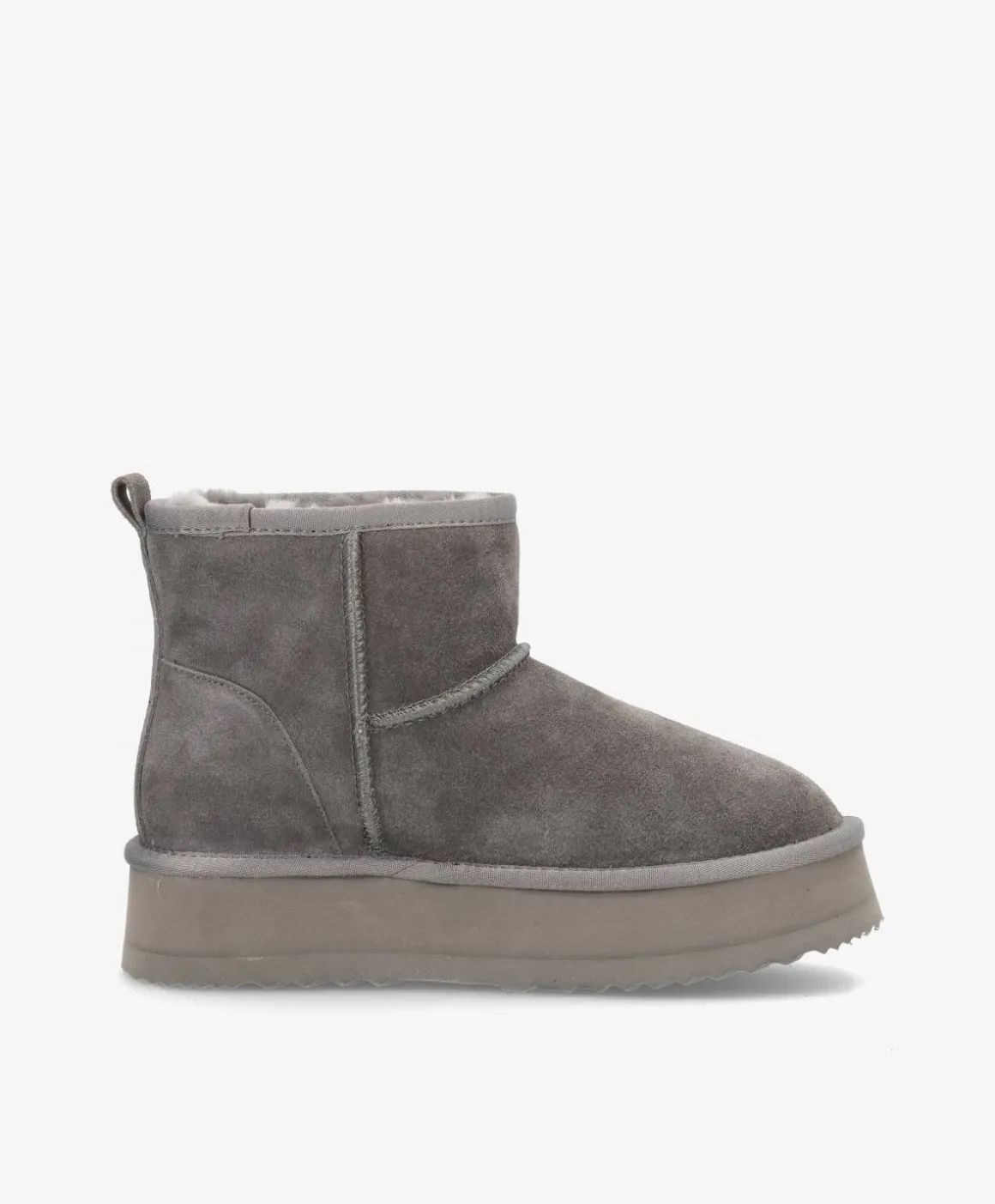 De lækreste bamsestøvler i en klassisk mørkegrå – perfekte til efterårsuniformen. De bløde støvler er lavet i et flot ruskind og har en høj sål, som giver et chunky look og løfter lidt. Støvlerne har ægte uld foring, som holder foden varm og giver ekstra komfort. De er nemme at påføre og er super komfortable, så de roligt kan bæres hele dagen. De fine bamsestøvler har desuden tydelige syninger, som bryder det rene design lidt.