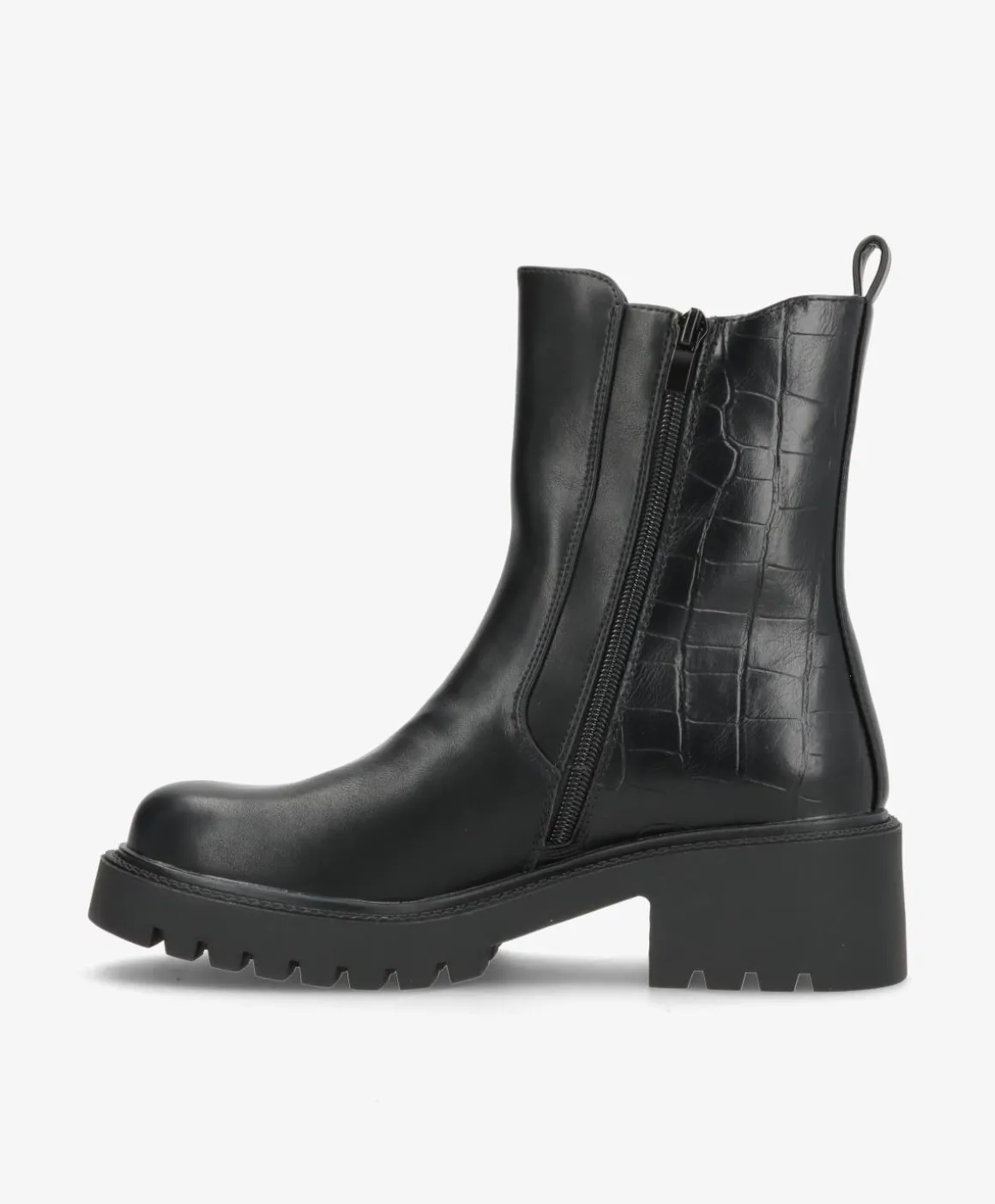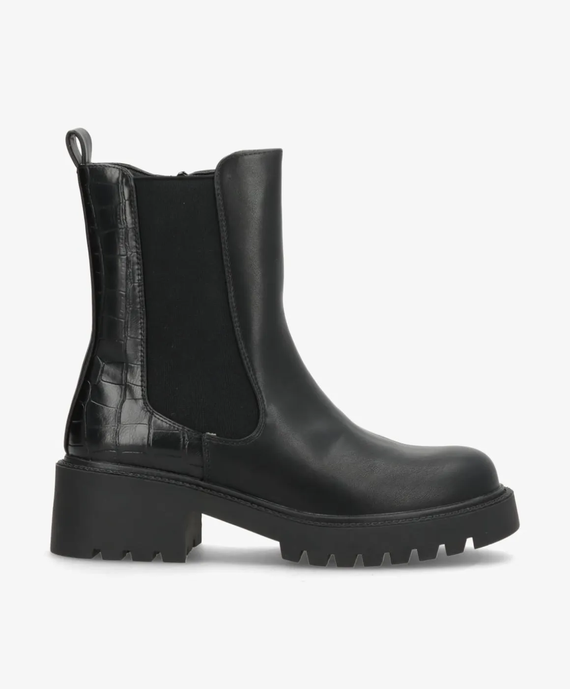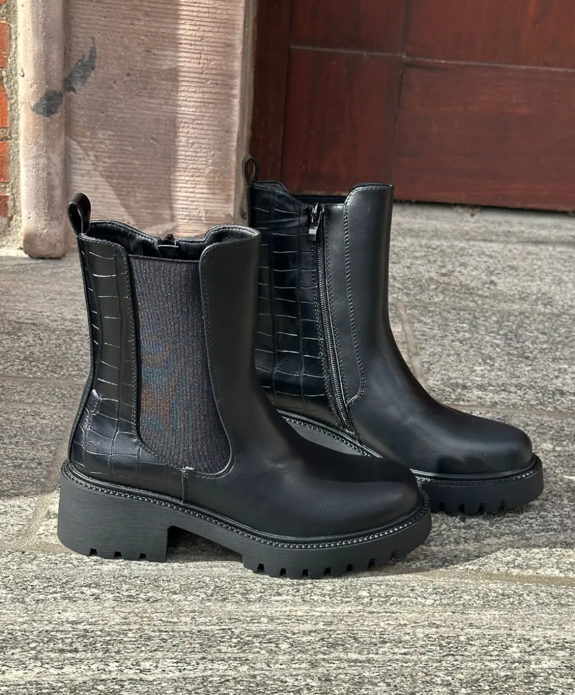 Smuk og stilren sort støvle i imiteret skind, der kombinerer enkelt design med trendy detaljer. Støvlen har en blød elastik i siden, der giver en fleksibel pasform, samt en solid gummisål, som sikrer komfort og stabilitet i hverdagen. Den blanke overflade i kombination med den let markerede struktur bagtil giver et elegant og moderne udtryk.