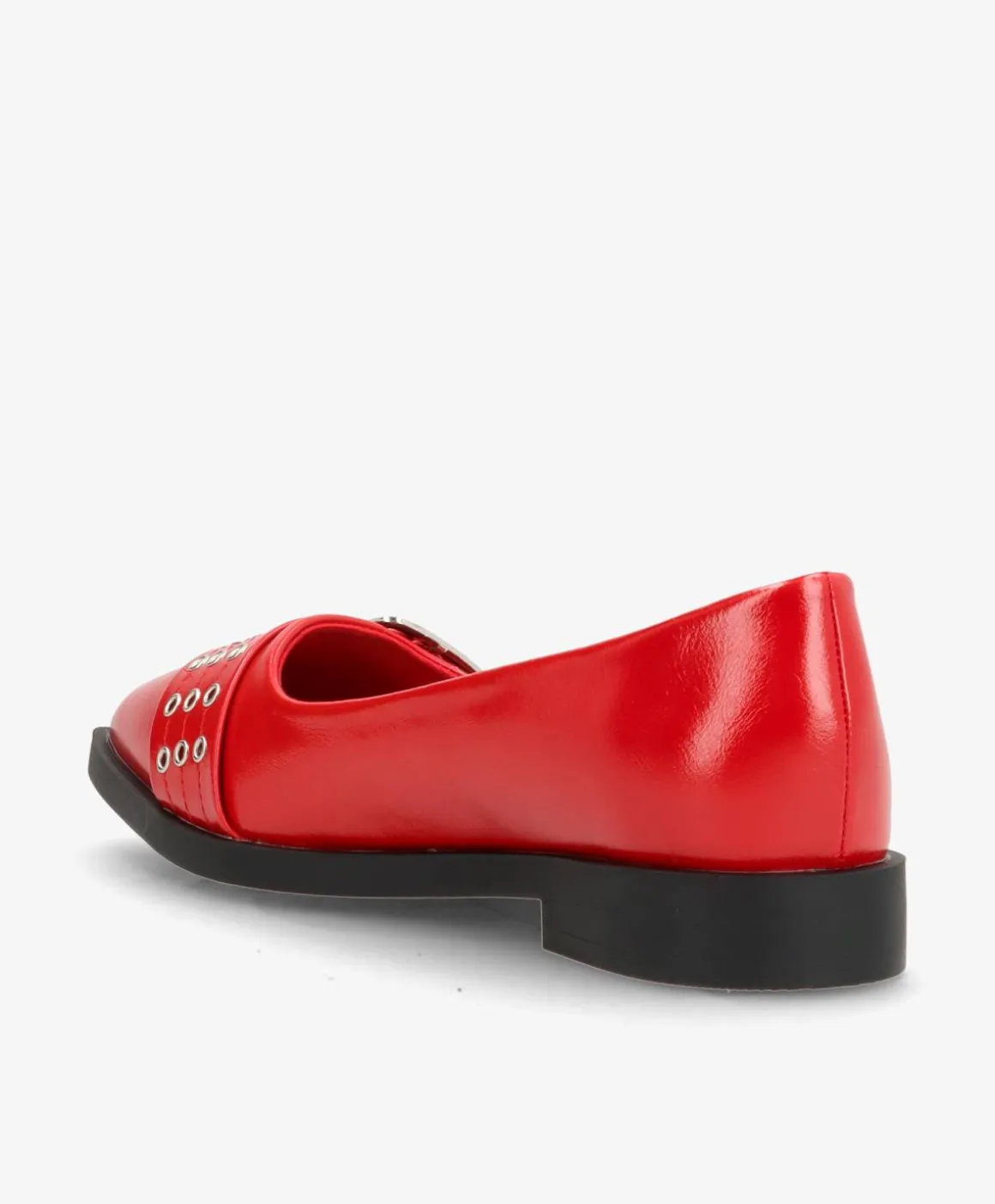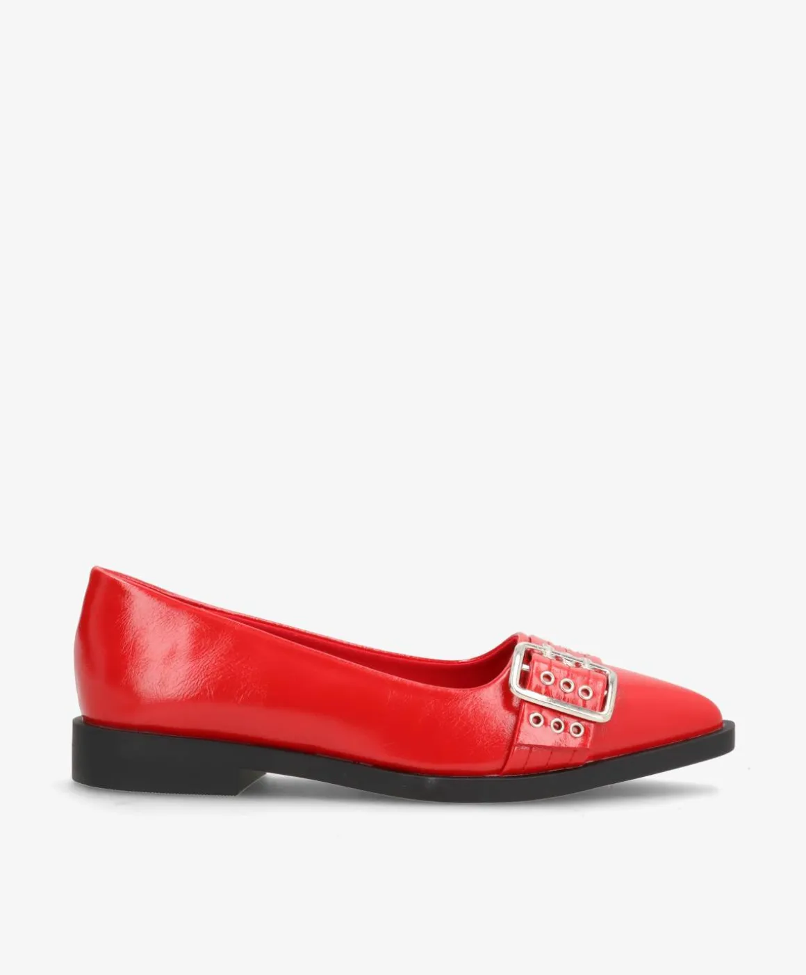 Skil dig ud med FULGATORE UNO ballerina fra Duffy – en modig og stilfuld sko i blank rød lak, der bringer farve og attitude til din garderobe. Den spidse snude og dekorative dobbeltspænde foran giver skoen et edgy twist, mens den flade hæl og det bløde materiale sikrer høj komfort hele dagen. Perfekt til dig, der vil kombinere feminin charme med et touch af rock’n’roll.