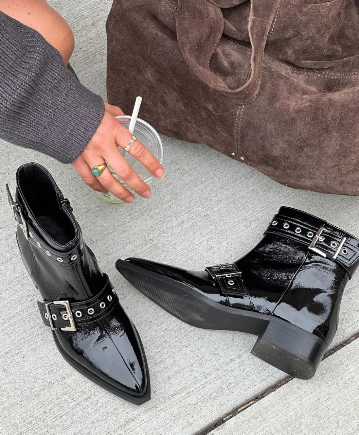 Bring attitude til dit look med de sorte JUSTIFIED lak støvler fra Phenumb Copenhagen. Disse støvler kombinerer den perfekte balance mellem kant og elegance. Lavet i en glansfuld sort lak, der straks fanger blikket, tilføjer de to dekorative spænder med sølvdetaljer et råt touch. De har en spids tå, der giver støvlerne et moderne udtryk, og den flade hæl gør dem behagelige nok til at have på hele dagen.