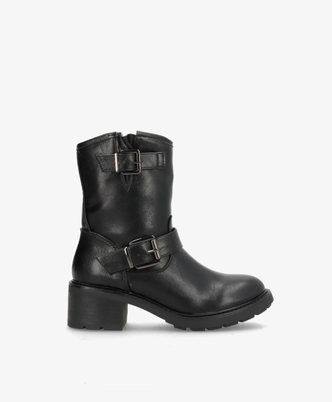 Denne støvle i imiteret skind har et robust og stilfuldt design, der er perfekt til både hverdag og fest. Den fås i både sort og brun, hvilket gør den alsidig og nem at matche med forskellige outfits. Støvlen er udstyret med dekorative spænder og en solid hæl, der giver ekstra højde og komfort. En praktisk lynlås på indersiden sikrer, at støvlen er nem at tage af og på. Den slidstærke gummisål giver et godt greb, hvilket gør støvlerne velegnede til hverdag.