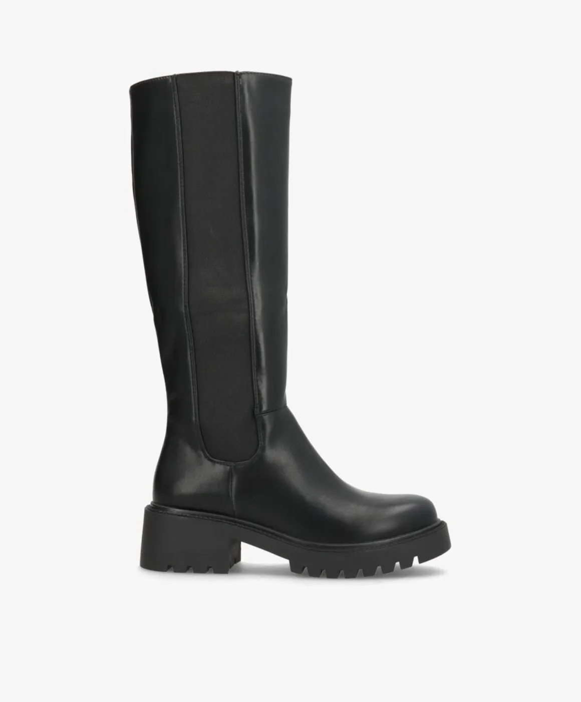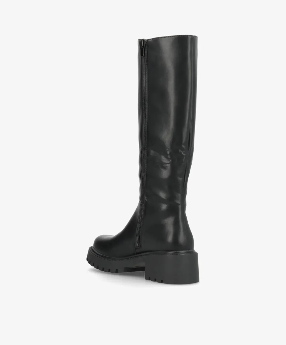 Elegant og klassisk lang støvle i sort imiteret skind, der kombinerer komfort og stil. Den høje silhuet giver et sofistikeret udtryk, mens den elastiske sidepanel og praktiske lynlås gør det nemt at få støvlen af og på. Den kraftige gummisål sikrer et stabilt fodfæste, perfekt til både byliv og hverdagsbrug.