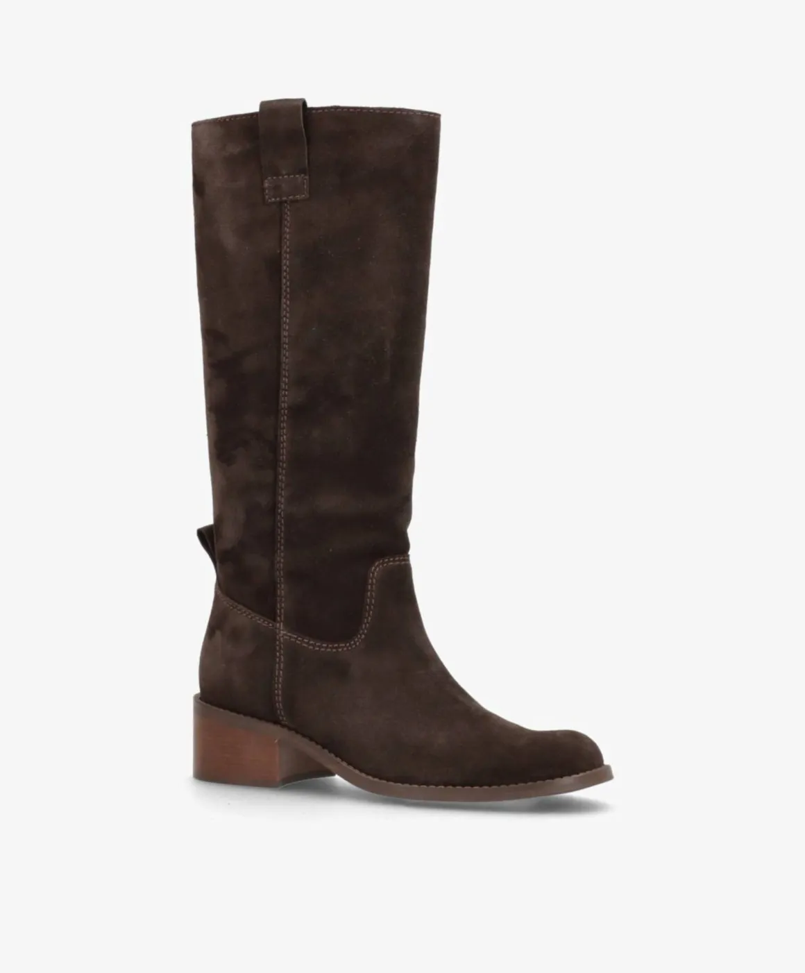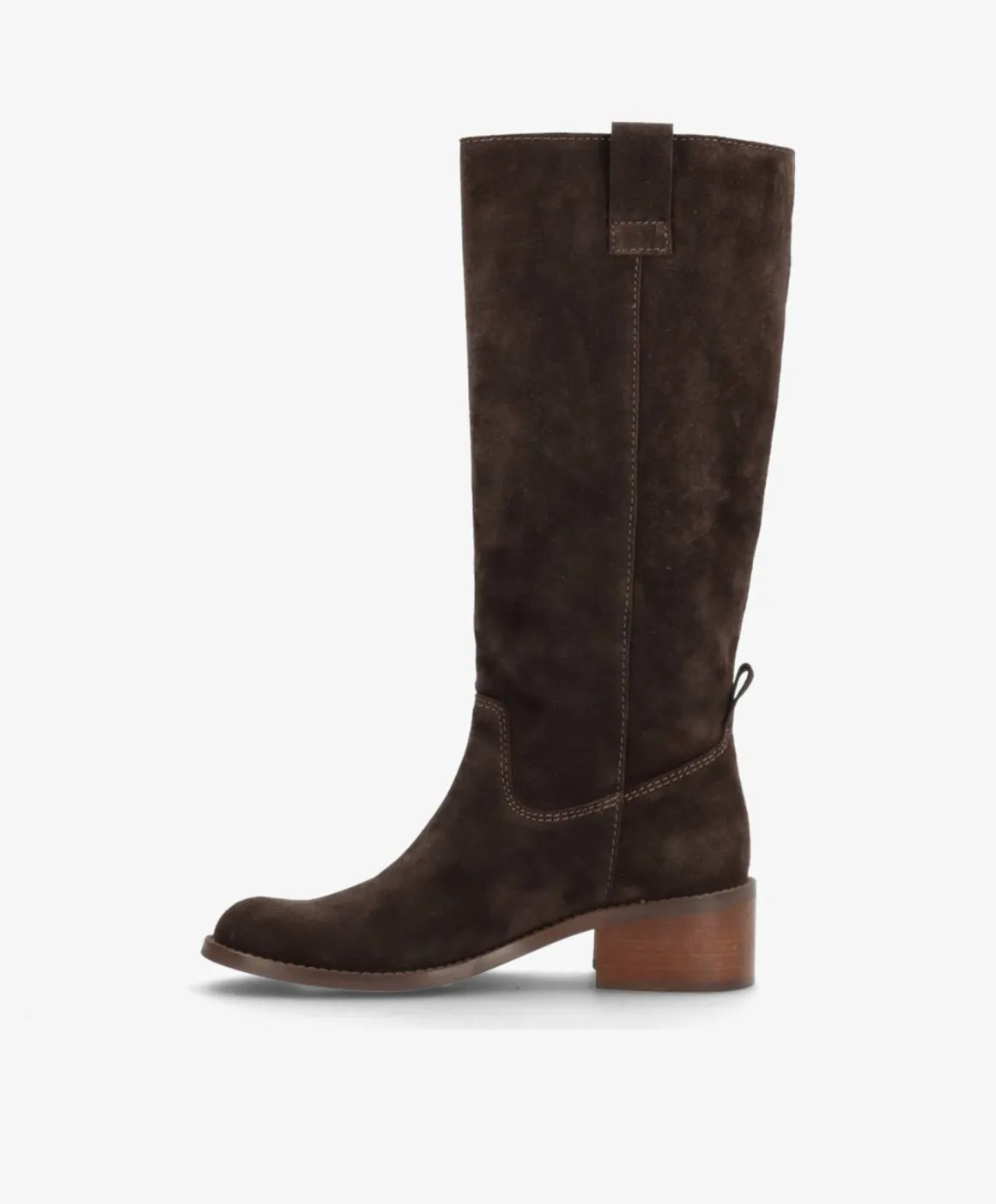 MARTINA er den perfekte langskaftede støvle til dig, der elsker enkelhed med karakter. Det bløde, mørkebrune ruskind kombineret med det klassiske western-inspirerede skaft giver et sofistikeret og naturligt look, som passer perfekt til både hverdagsjeans og strikkjoler. Den stabile hæl og let rundede snude gør støvlen komfortabel hele dagen – uden at gå på kompromis med stilen.