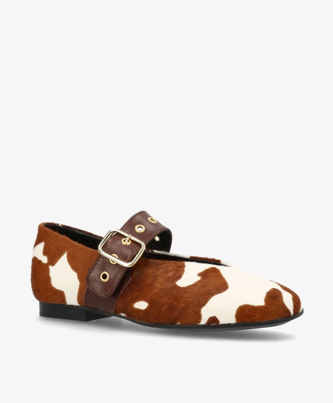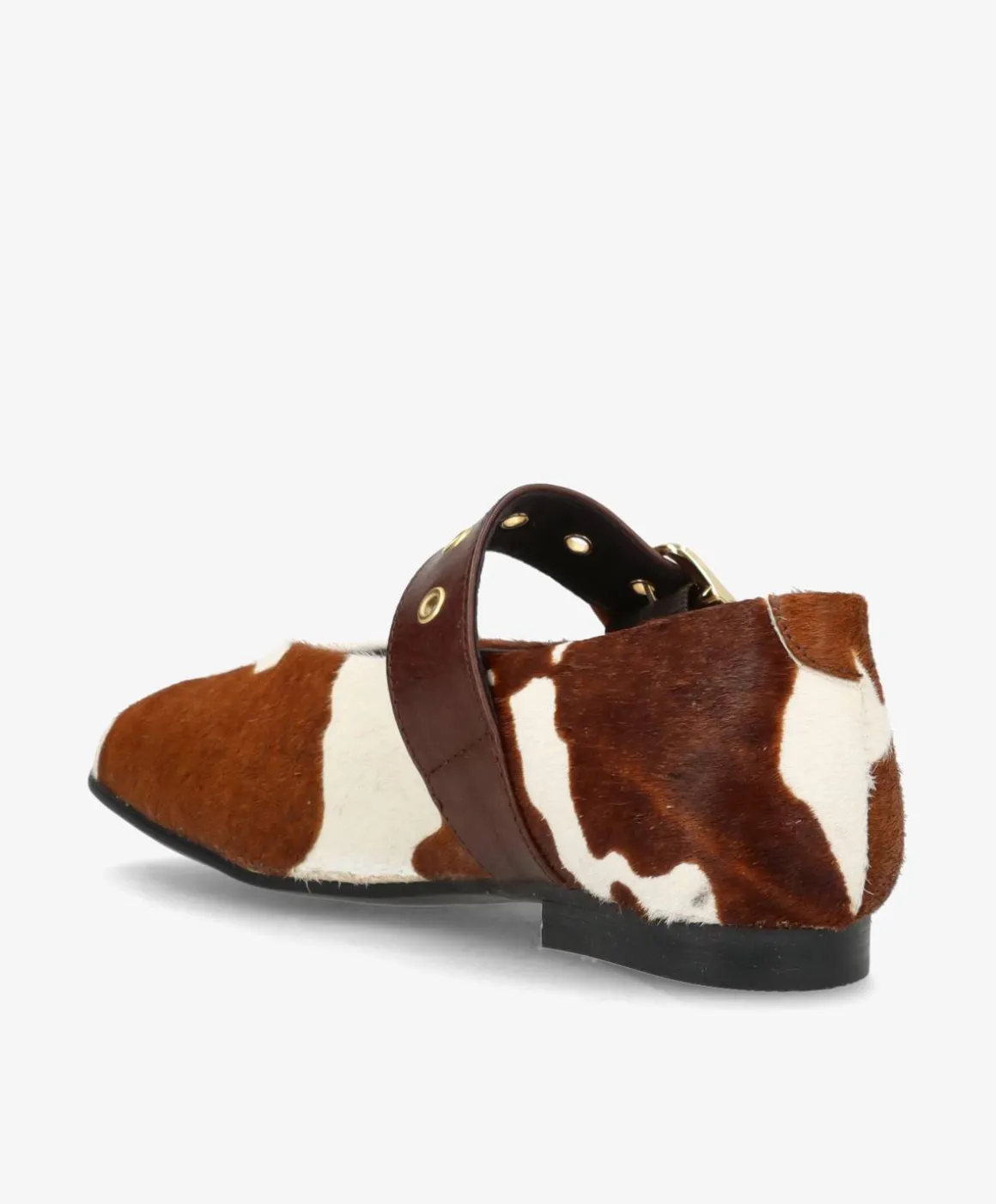 MORE er en elegant ballerina, der kombinerer et eksklusivt udtryk med et markant design. Den er udført i pony hair med et smukt, naturligt mønster, som giver skoen karakter og personlighed. Den justerbare rem med guldfarvet spænde tilføjer et feminint touch og sikrer samtidig en behagelig og stabil pasform.