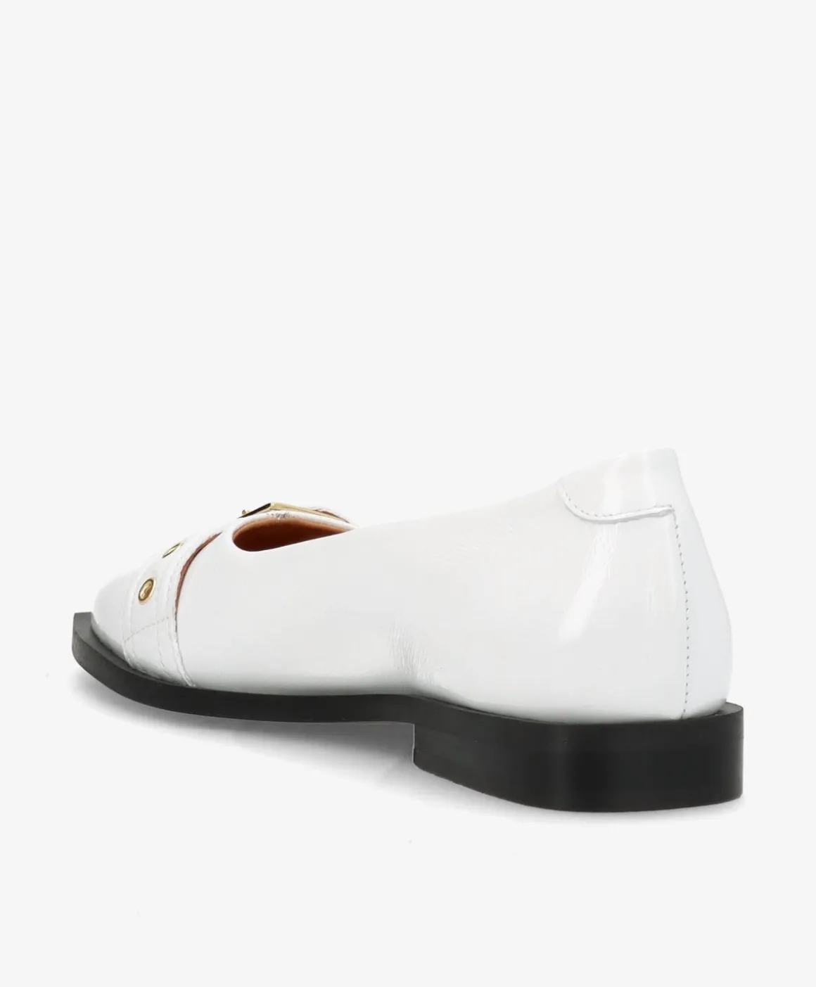 De smukkeste ballerinaer fra phenumb i en klassisk hvid lak med spænde. Ballerinaerne er det perfekte miks mellem det rå og feminine, og passer derfor perfekt ind i garderoben hos hende, der elsker at lege med stiludtrykket. Ballerinaerne har en spids snude, som giver et elegant look, og hælen er kantet, hvilket giver et moderne touch til designet. På fronten er de prydet med et groft spænde, der binder det hele sammen. De smukke ballerinaer kan bruges både til hverdag og fest, og kan styles på et væld af måder.