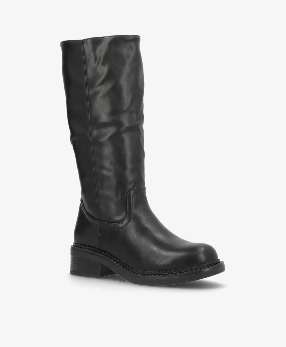 NAYA er en knæhøj støvle i flot, sort imiteret læder, der kombinerer enkelhed med karakter. Det rene design med rund snude og diskrete syninger gør den let at style med både strikkjoler, jeans og leggings. Den brede hæl og solide ydersål sikrer stabilitet og komfort til hverdagens mange skridt.
