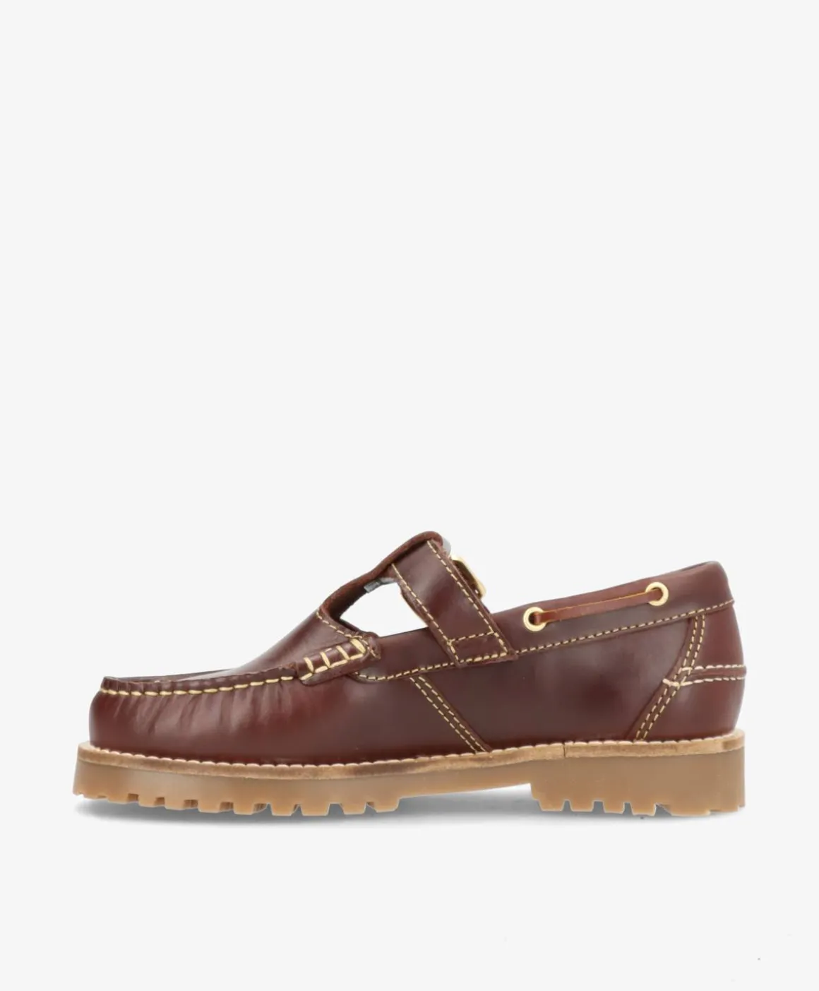 RUDDER T i brun læder fra phenumb copenhagen kombinerer klassisk sejlersko-look med et moderne twist. Den justerbare spænde giver både karakter og funktion, mens det bløde læder og de gyldne detaljer tilføjer en eksklusiv finish. Den solide gummisål med dybt mønster sikrer god komfort og greb, uanset hvor du går.