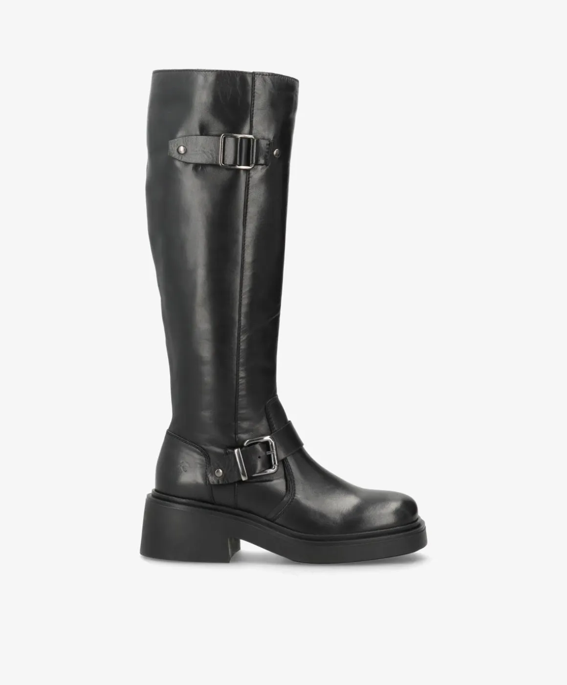 SADDLE LONG BUCKLE er en lang støvle i sort læder fra Shoedesign Copenhagen, designet til kvinder der ønsker et mere markant og moderne udtryk. De dekorative spænder med sølvdetaljer giver støvlen et eksklusivt biker-inspireret look, mens den solide blokhæl og gummisål sikrer både komfort og stabilitet.