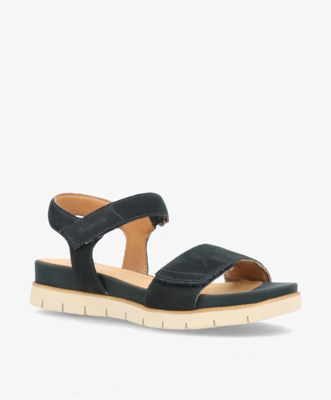 Giv dit outfit et farverigt løft med denne navy blå sandal fra Tamaris i imiteret skind. Den bløde fodseng og den fleksible, lyse sål sikrer maksimal komfort, mens de brede velcroremme giver både god støtte og nem justering. Den flade sål med let hæl gør den perfekt til lange sommerdage – fra byliv til ferieture.