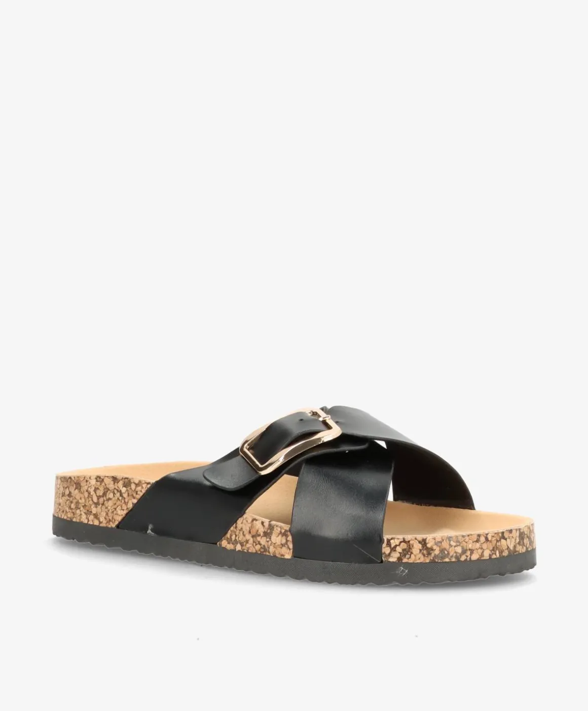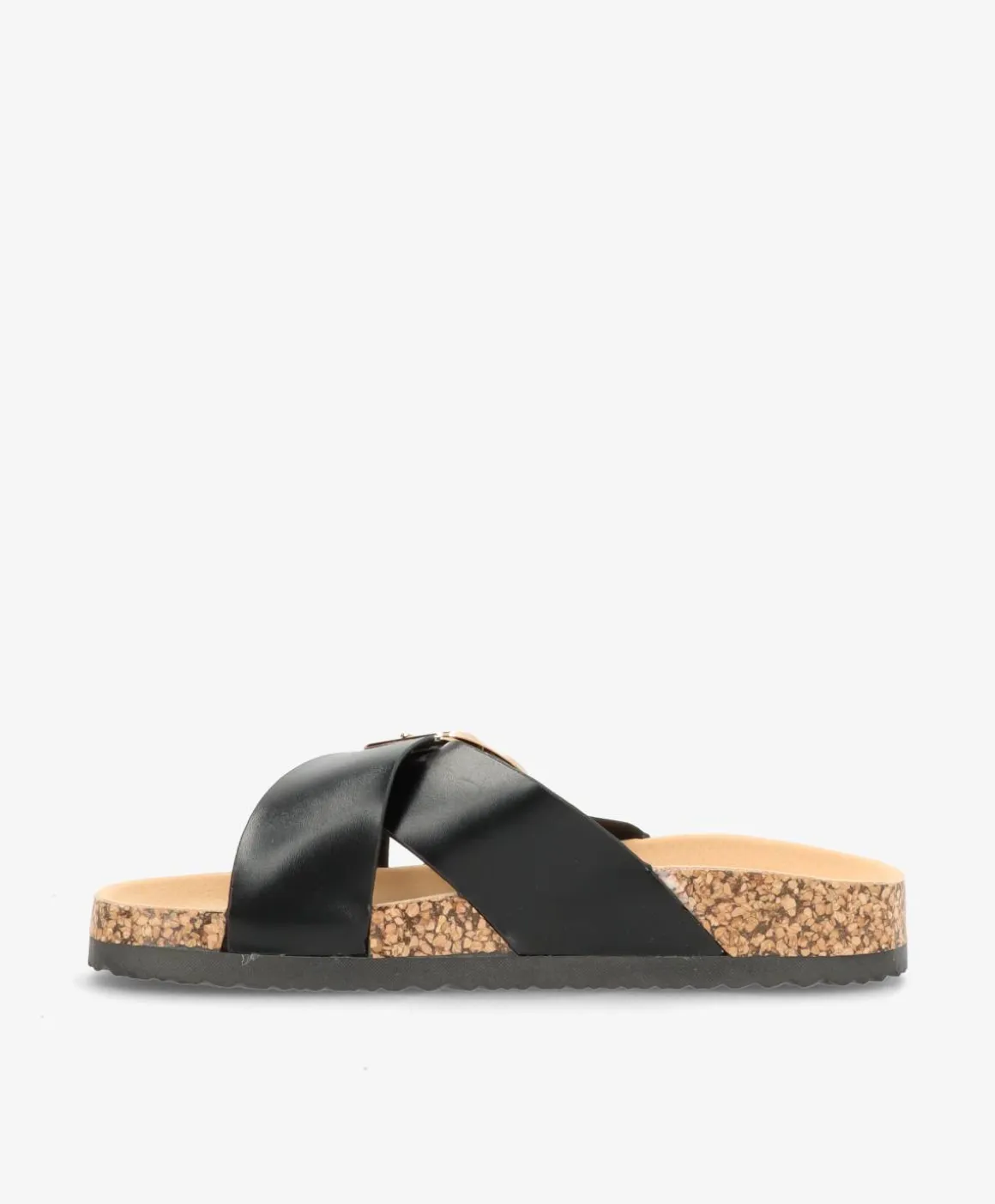 En klassisk sandal i sort med fine detaljer. Sandalerne har en biosål, som både giver et cool pift til designet og sørger for super god komfort. De er nemme at påføre med den åbne pasform, og de har krydsremme foran.