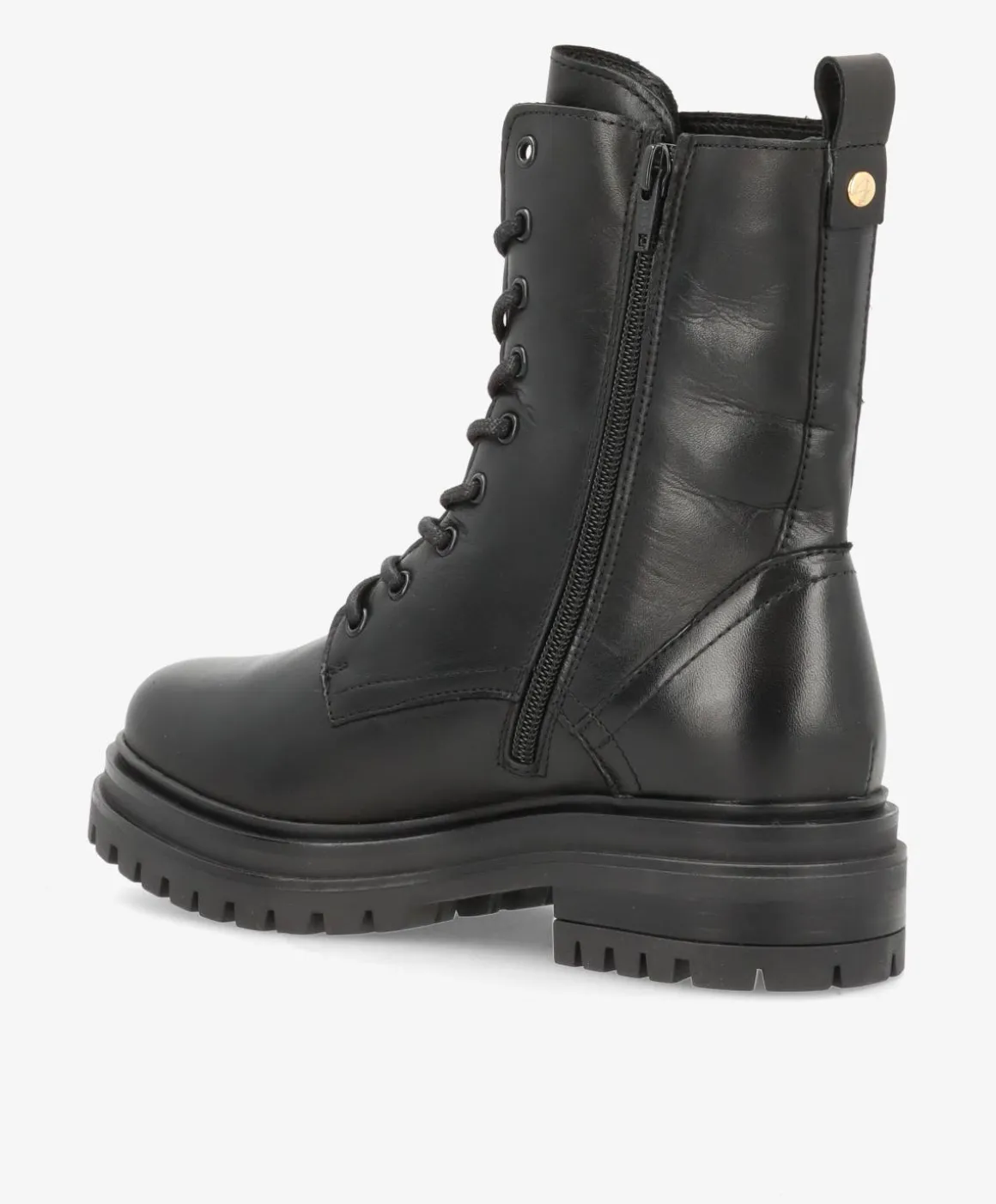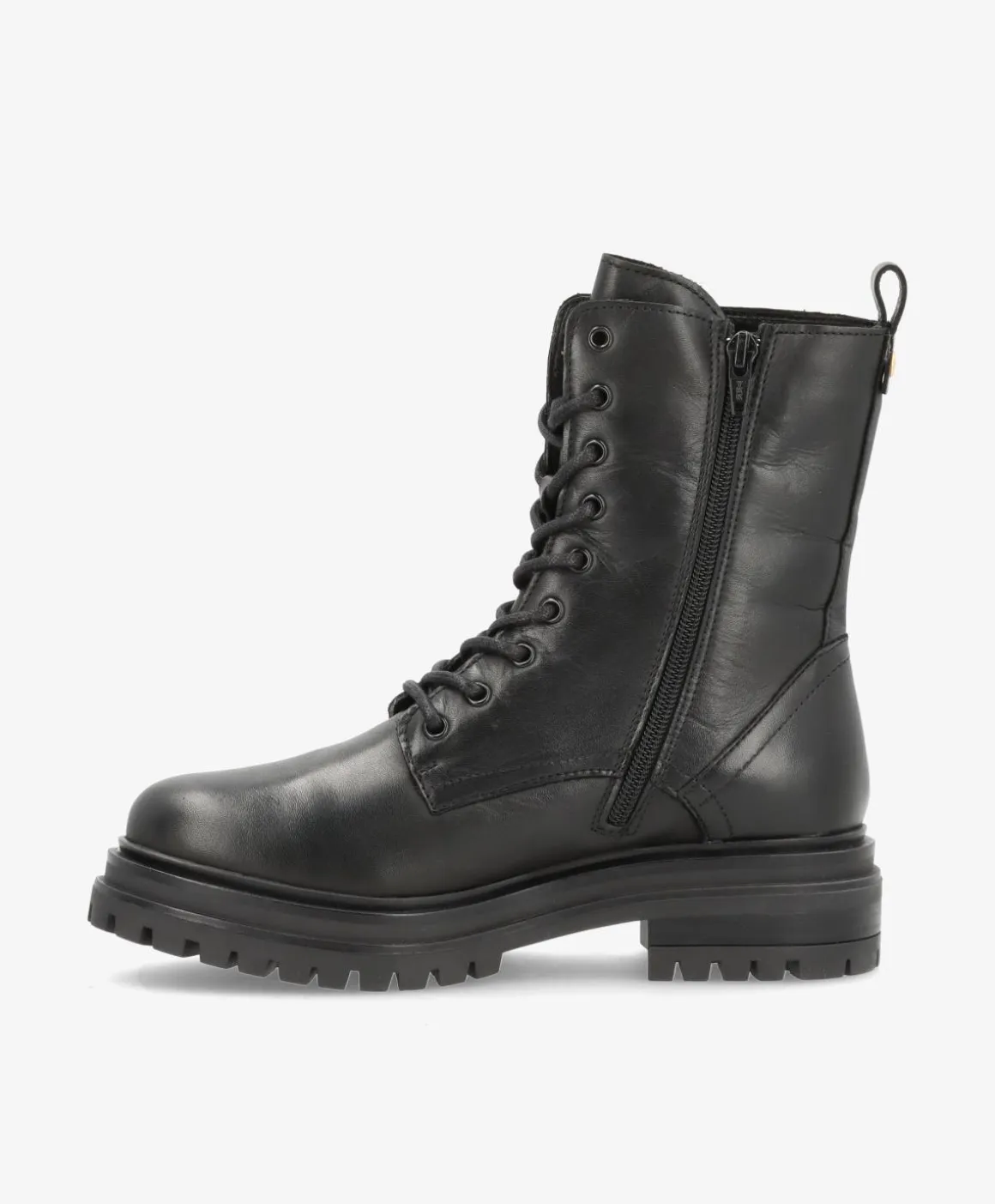 SMILLA fra Shoedesign Copenhagen er den perfekte støvle til dig, der ønsker kant og komfort i ét design. Med sit sorte, bløde læder, elegante guldlynlås og klassiske snørebånd kombinerer denne støvle et feminint udtryk med rå detaljer. Den massive gummisål og de indvendige lynlåse giver både god støtte og nem adgang, så du kan tage støvlen på i farten – uden at gå på kompromis med looket.