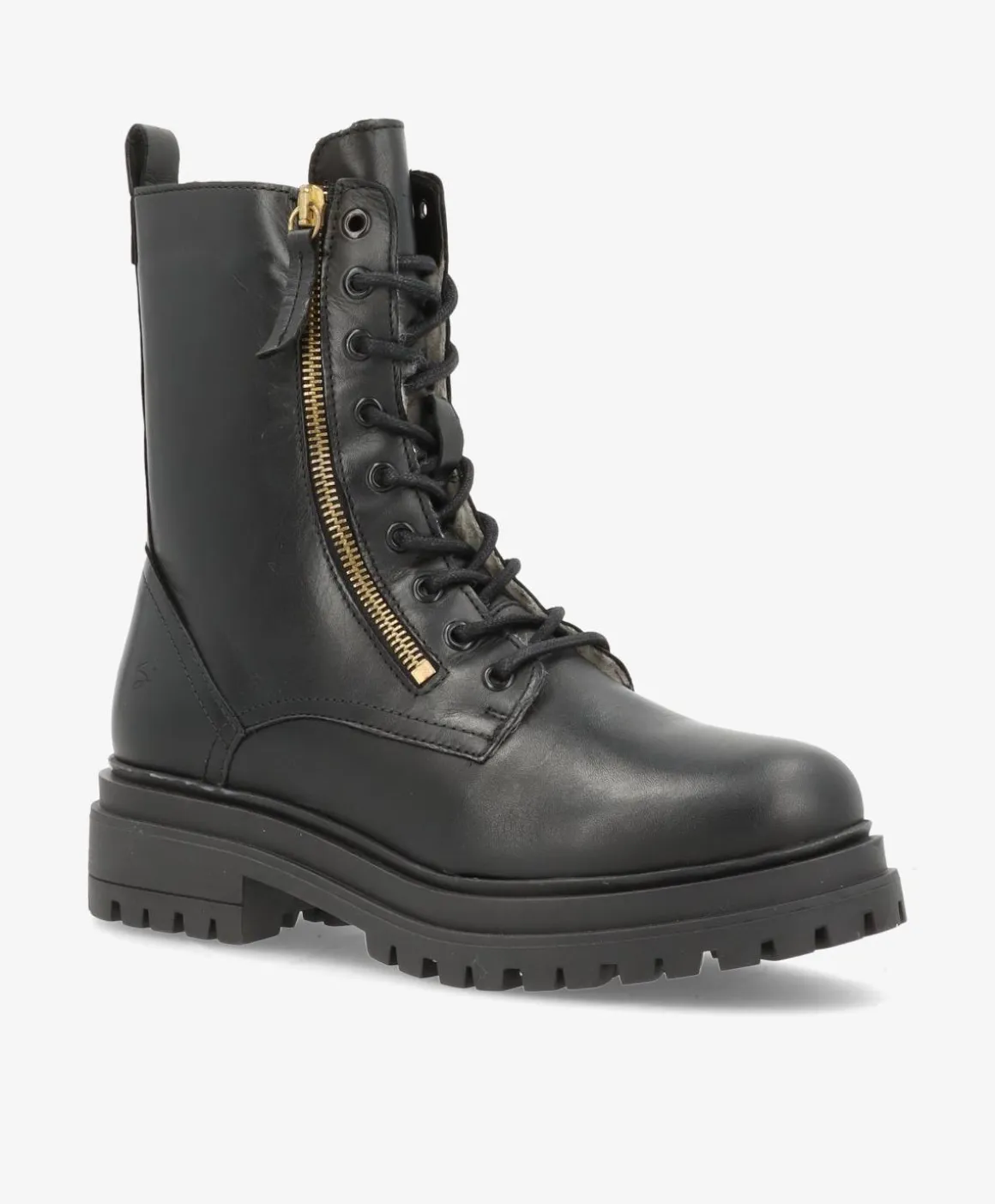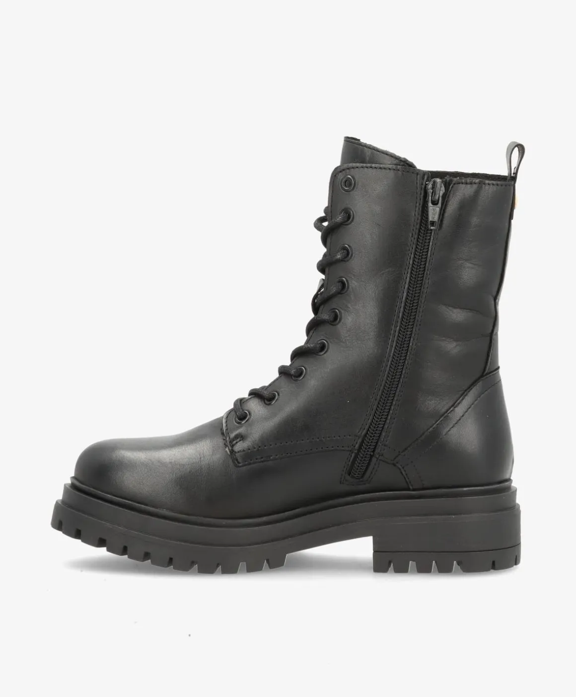 Med SMILLA WARM får du en elegant og funktionel støvle, der kombinerer klassisk snøre-design med moderne detaljer. Den er udført i smukt sort læder og har en praktisk guldfarvet lynlås på ydersiden samt en funktionel lynlås på indersiden, der gør den nem at tage af og på.